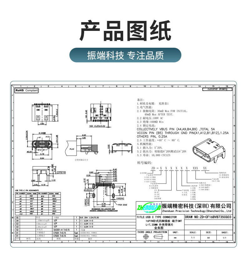 工場カスタムTYPE-C16Pメスソケット基板実装型SMT四脚プラグインL7.35三モード弾性振動端子付きUSB