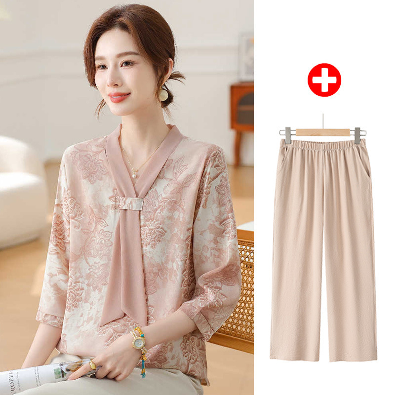 中高年の夏服のシャツの女性のお母さんの夏のスーツのおばあさんの7分袖の上着の老人の服のおばあさんの服