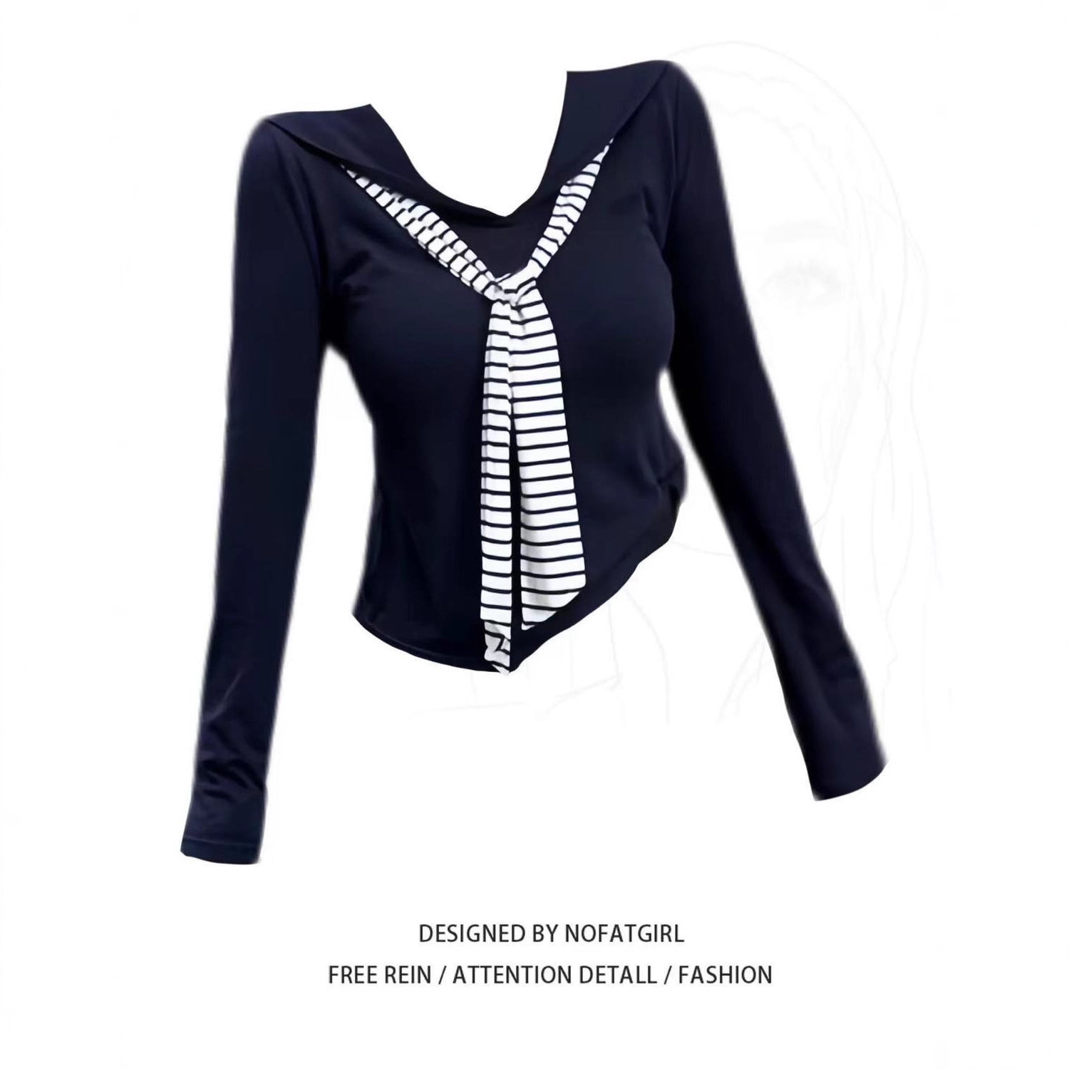 秋季撞色韩系学院风条纹领带长袖T恤女早秋修身显瘦上衣休闲百搭