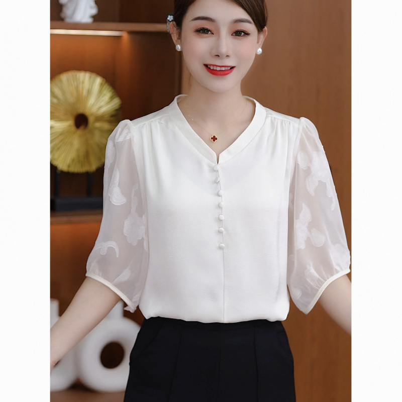 夏の半袖シフォンシャツ女装夏服2025新作泡袖中袖上着シック七分袖ブラウス