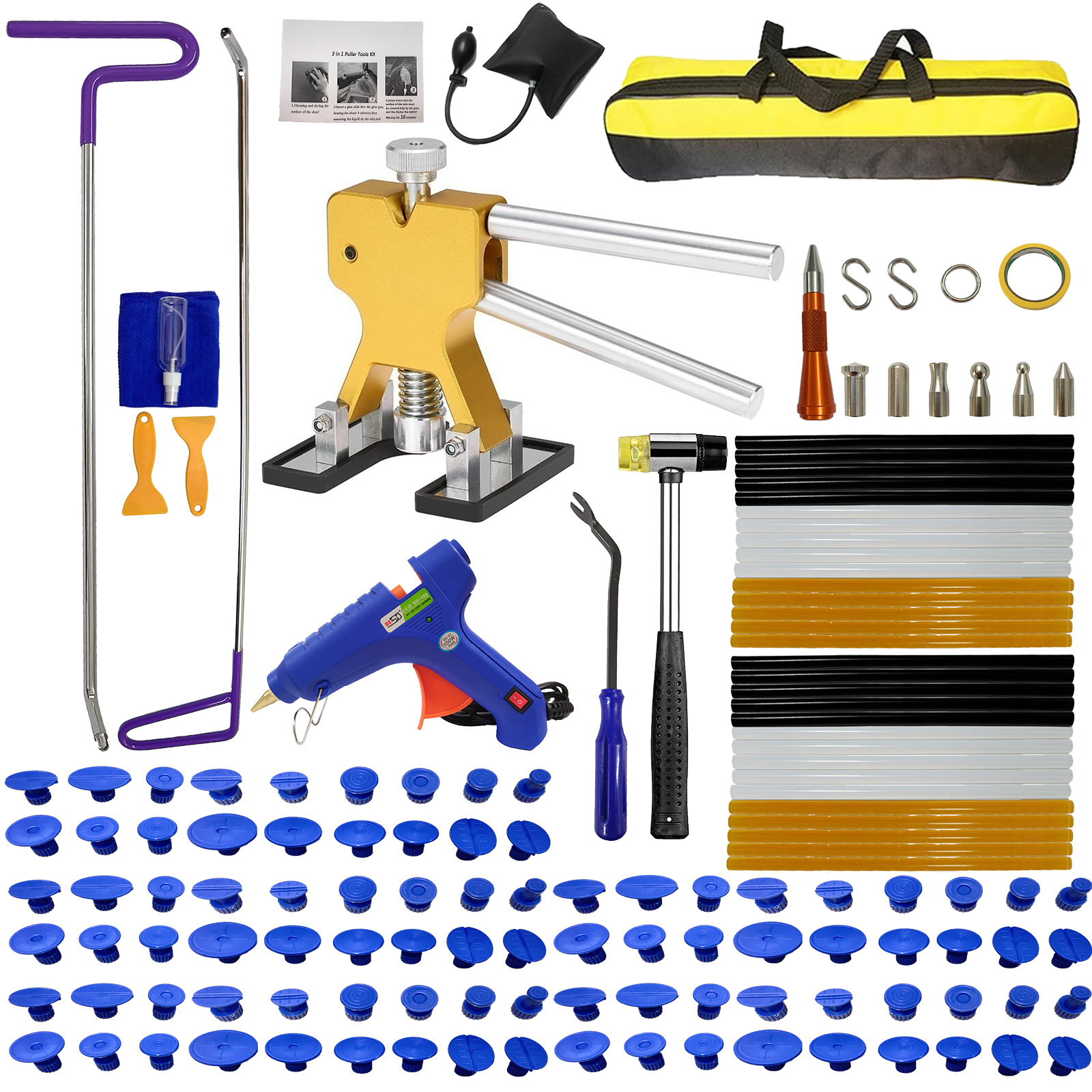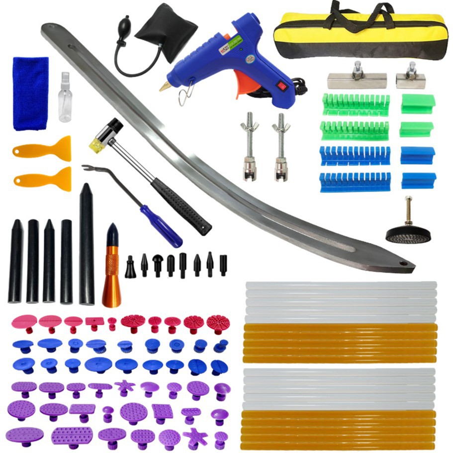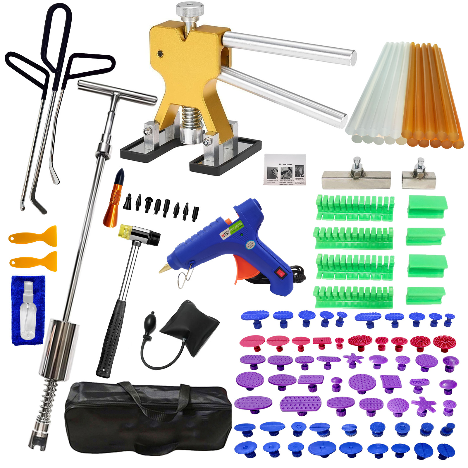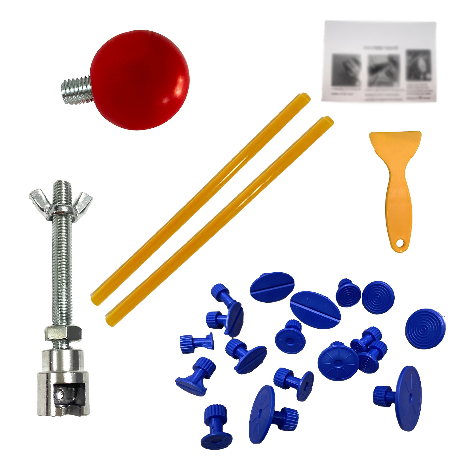 1x LED dent checking light,1x suction cup stander / 1x bridge puller,5x blue glue tabs / 1x bridge puller / 1x golden lifter / 24x purple glue tabs,18x blue glue tabs,10x red glue tabs / 1x glue gun,5x black glue stick,5x yellow glue stick.