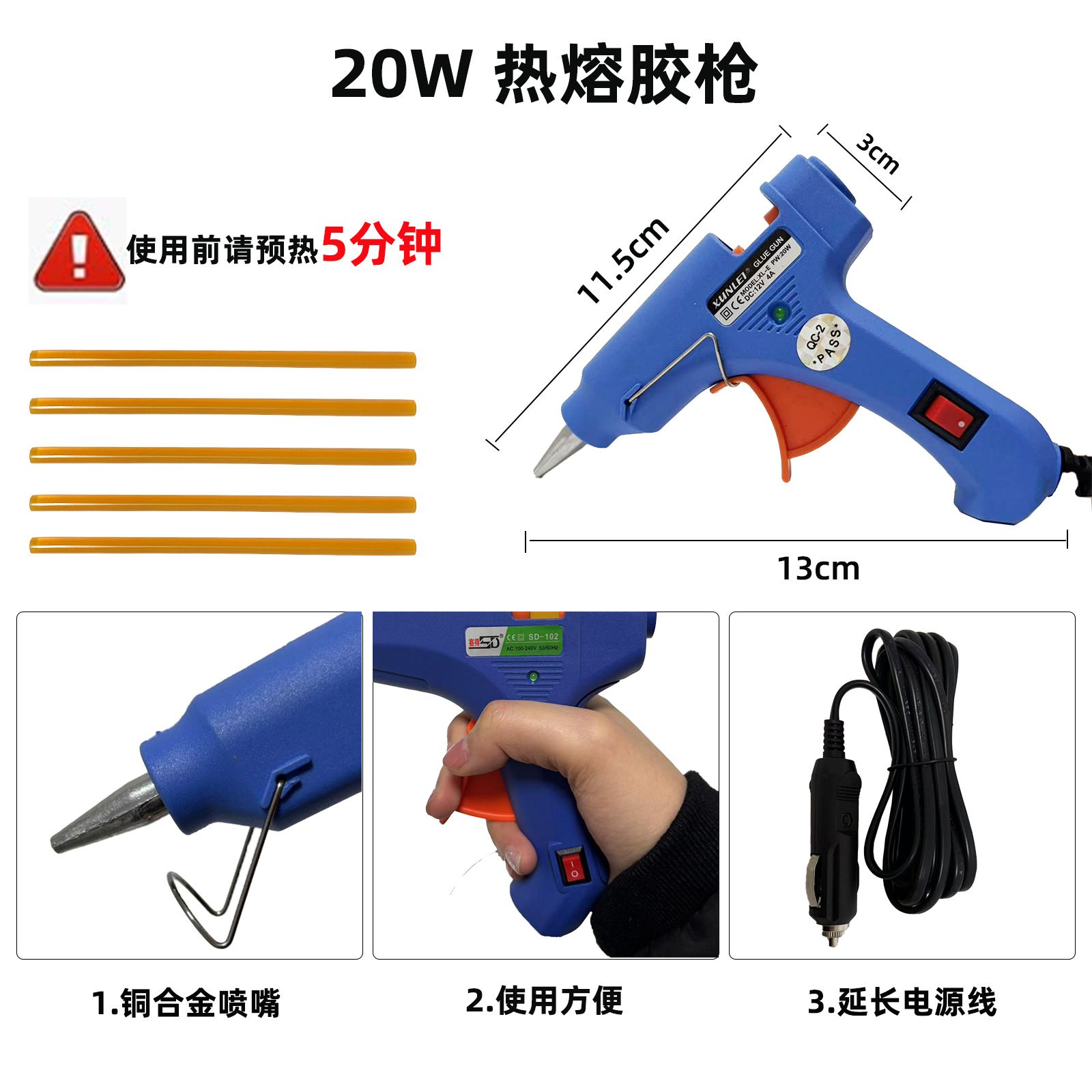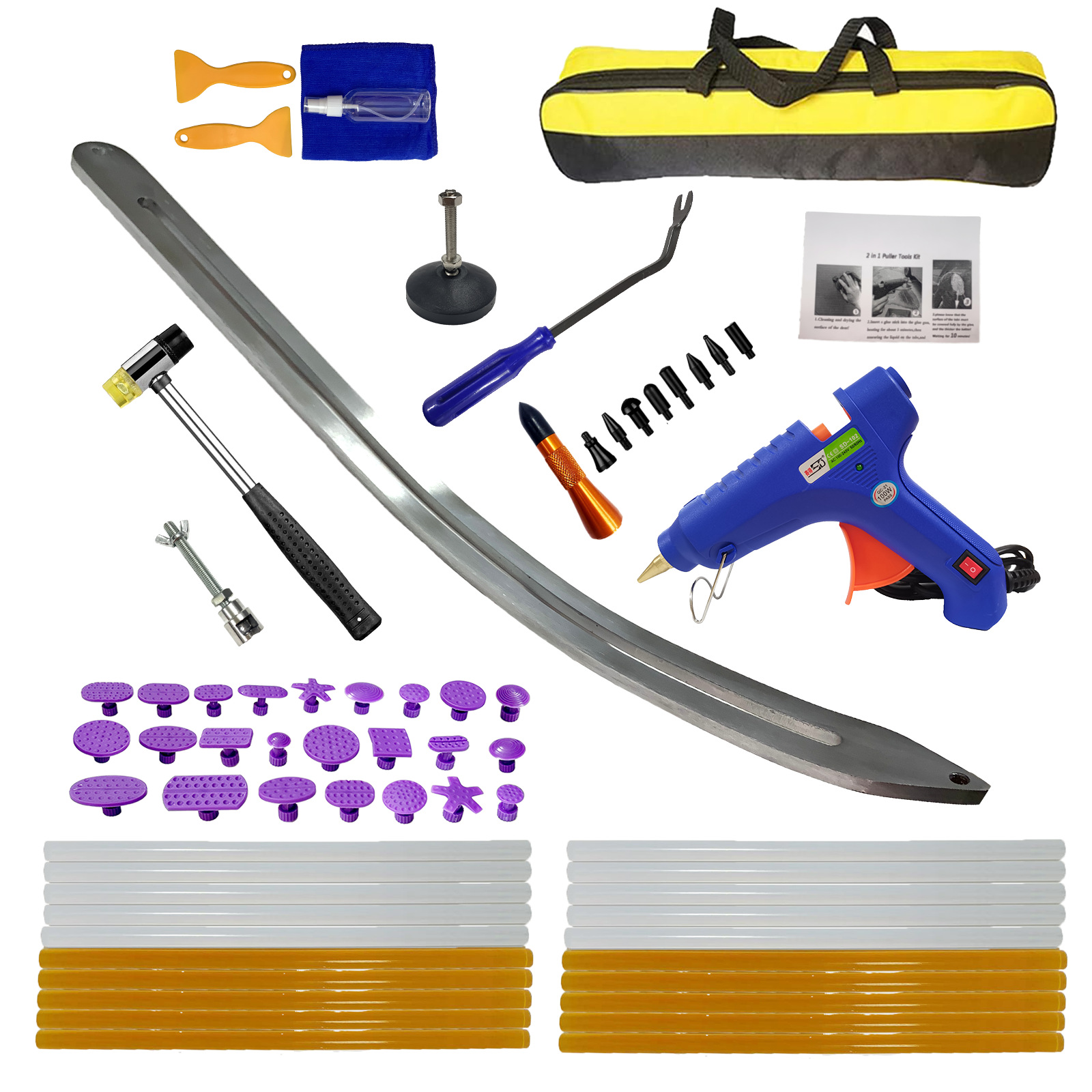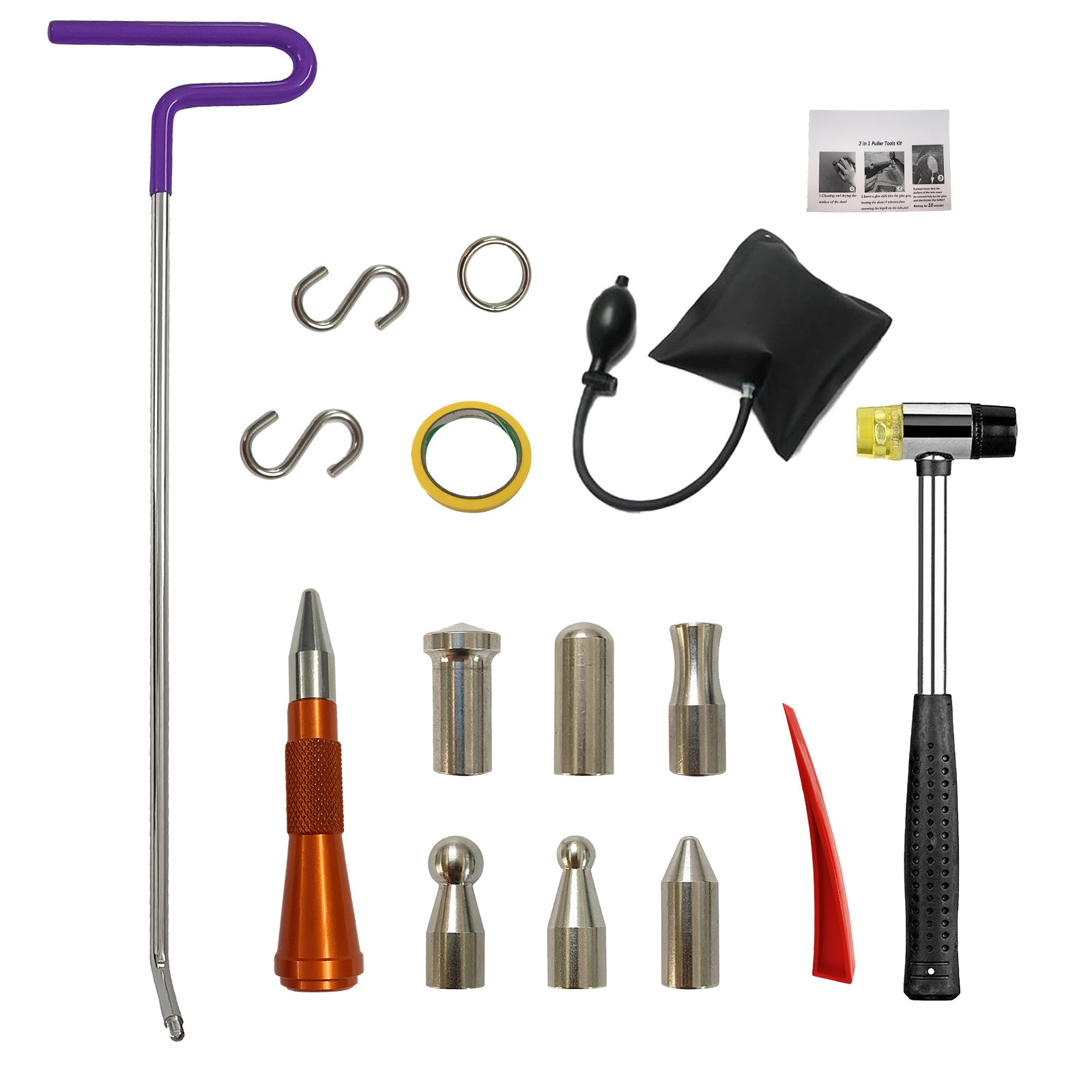 1x LED dent checking light,1x suction cup stander / 1x bridge puller,5x blue glue tabs / 1x bridge puller / 1x golden lifter / 24x purple glue tabs,18x blue glue tabs,10x red glue tabs / 1x glue gun,5x black glue stick,5x yellow glue stick.