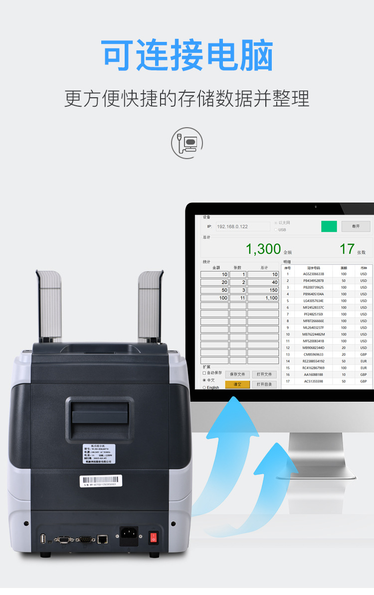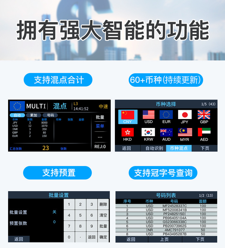 複数通貨対応縦型紙幣計数機、複数通貨対応ドル・ユーロ・香港ドル外貨紙幣計数機
