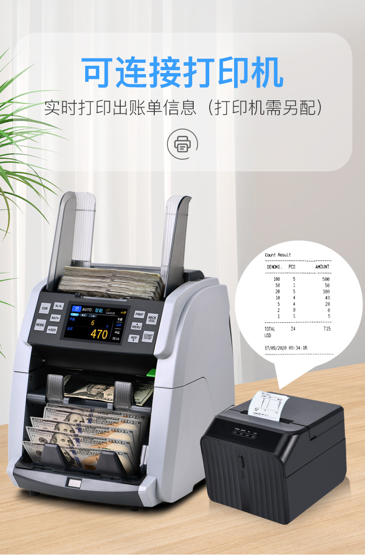 多通貨対応紙幣計数機、業務用紙幣計数機、銀行専用印刷機能付き混合計数・合計機能搭載、外国貿易用紙幣検証機