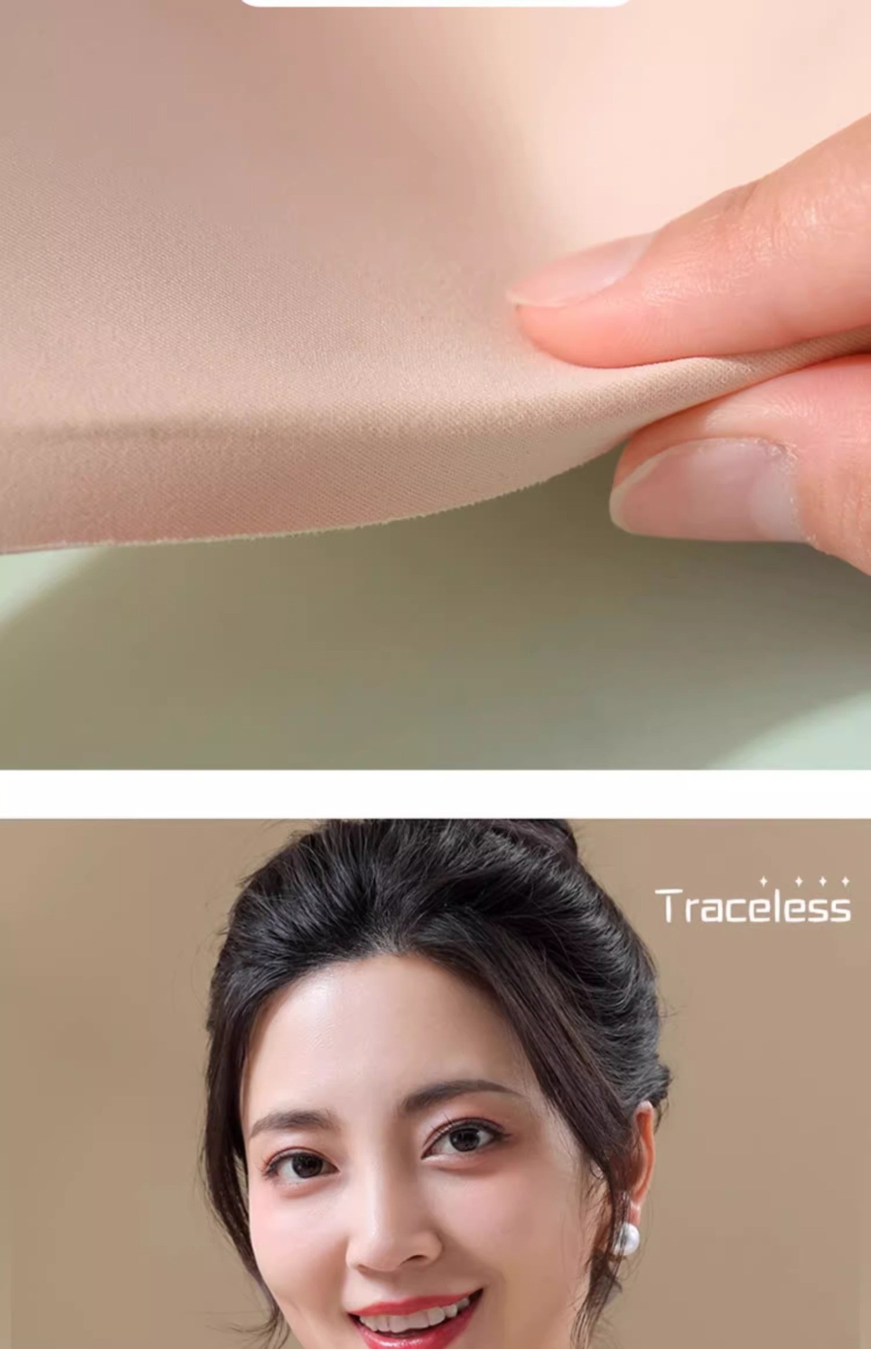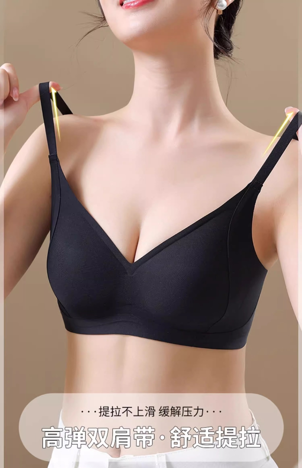 ゼリーは引っ張ります。無痕下着の女性は胸パッドを持っています。