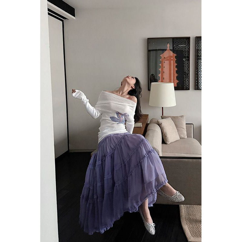 香芋紫层叠感蛋糕裙透气网纱半身裙女夏季新款印花显瘦上衣套装潮