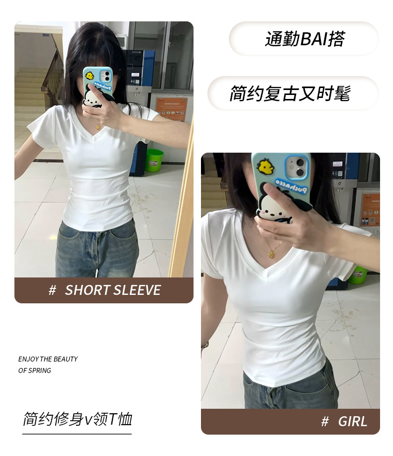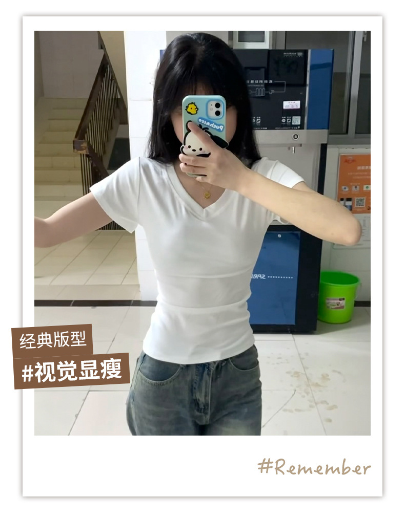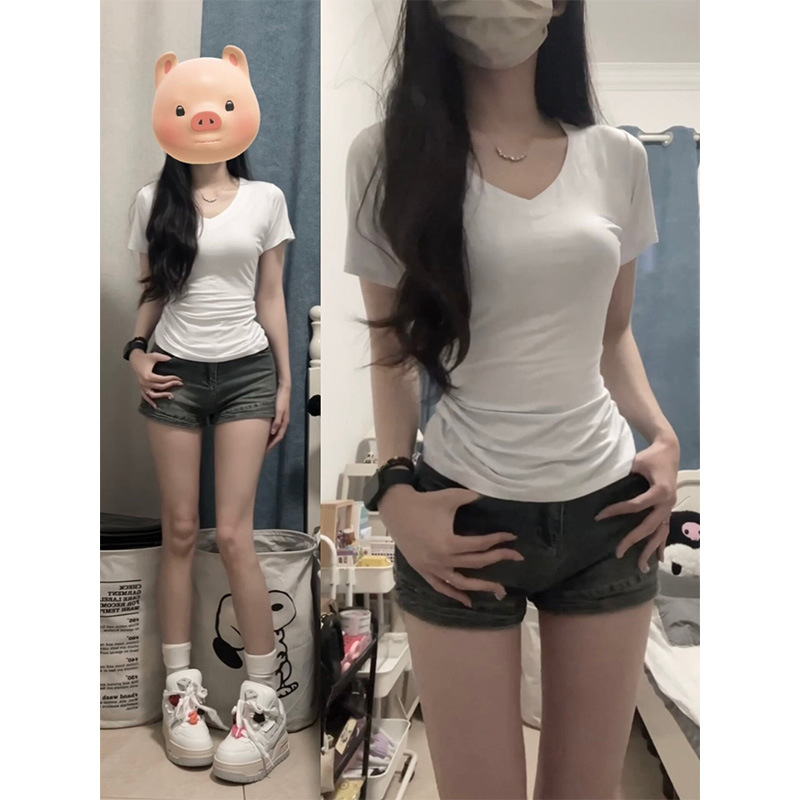 アメリカンVネックピュアコットン右肩夏半袖Tシャツレディース白スリムフィットホットガールボトリングシャツトップ