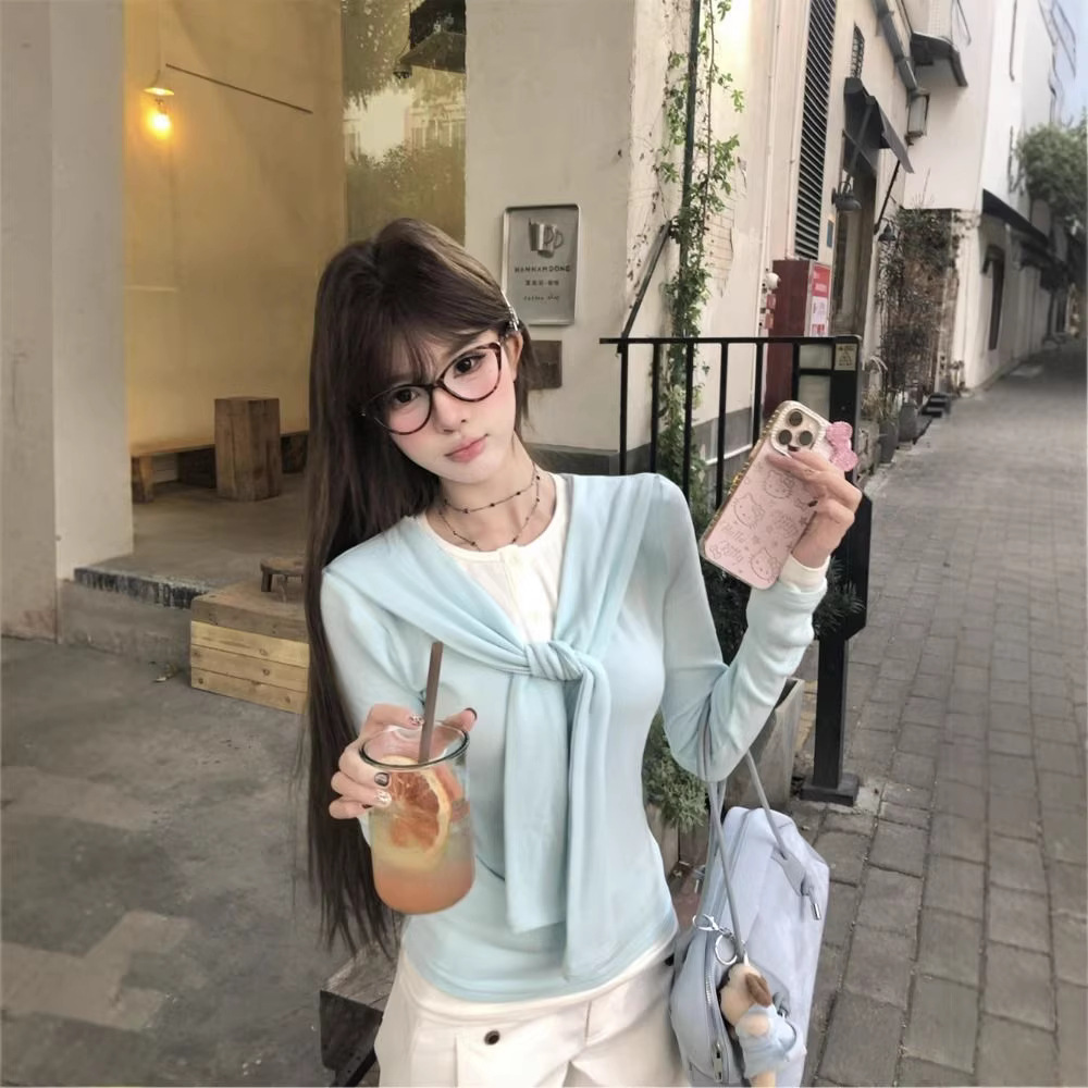 美式拼接假两件绑带长袖T恤女秋季修身设计感撞色辣妹打底衫上衣