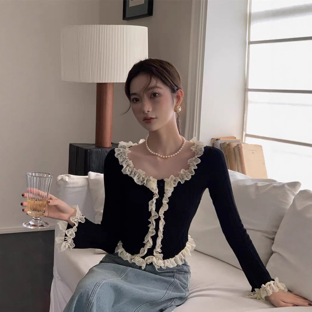 法式气质甜辣v领短款蕾丝针织打底衫女正肩上衣独特别致长袖秋冬