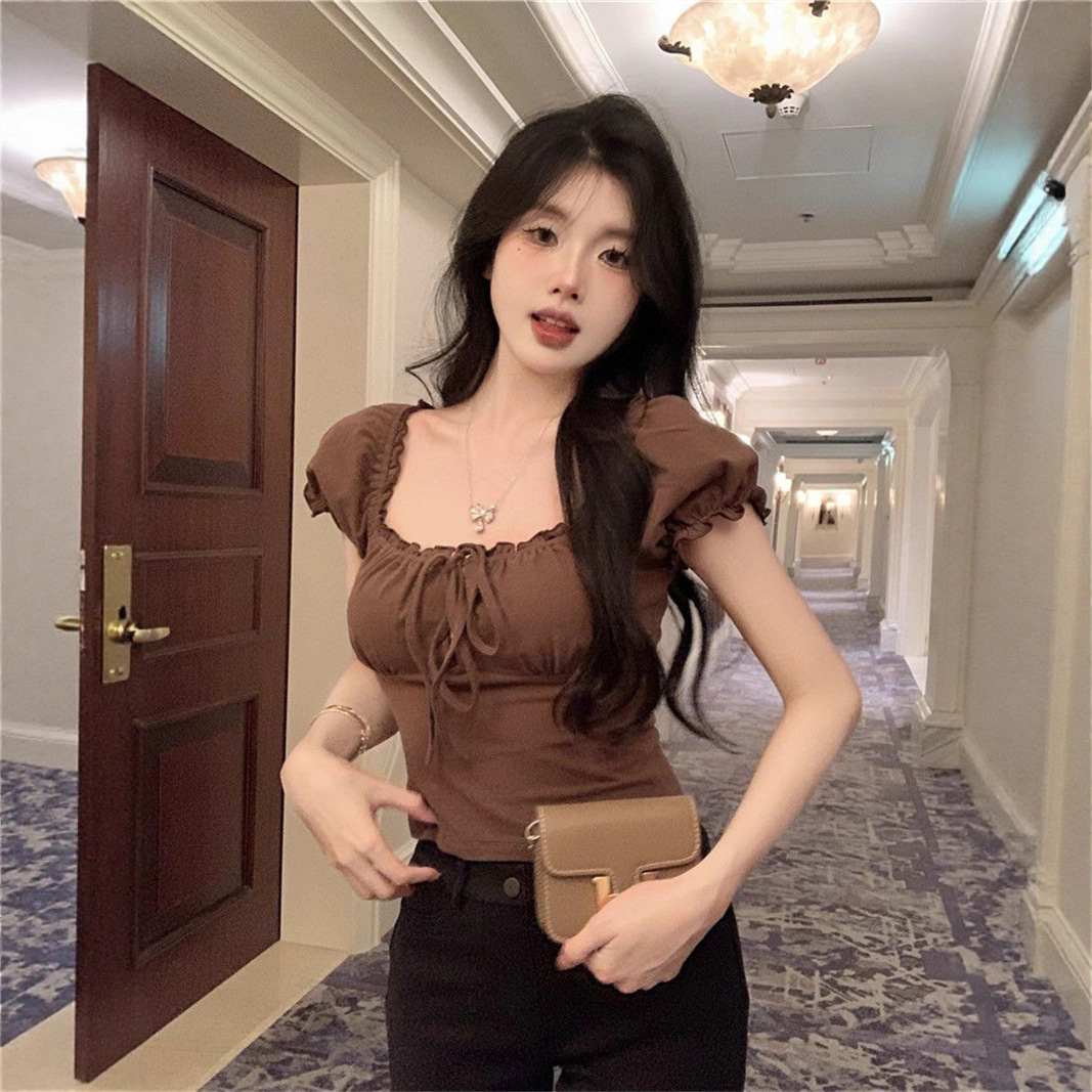 フレンチセクシーホットガールスタイルパフスリーブ半袖Tシャツレディース夏純粋な欲望露出鎖骨スリムショートトップレディースTトレンド