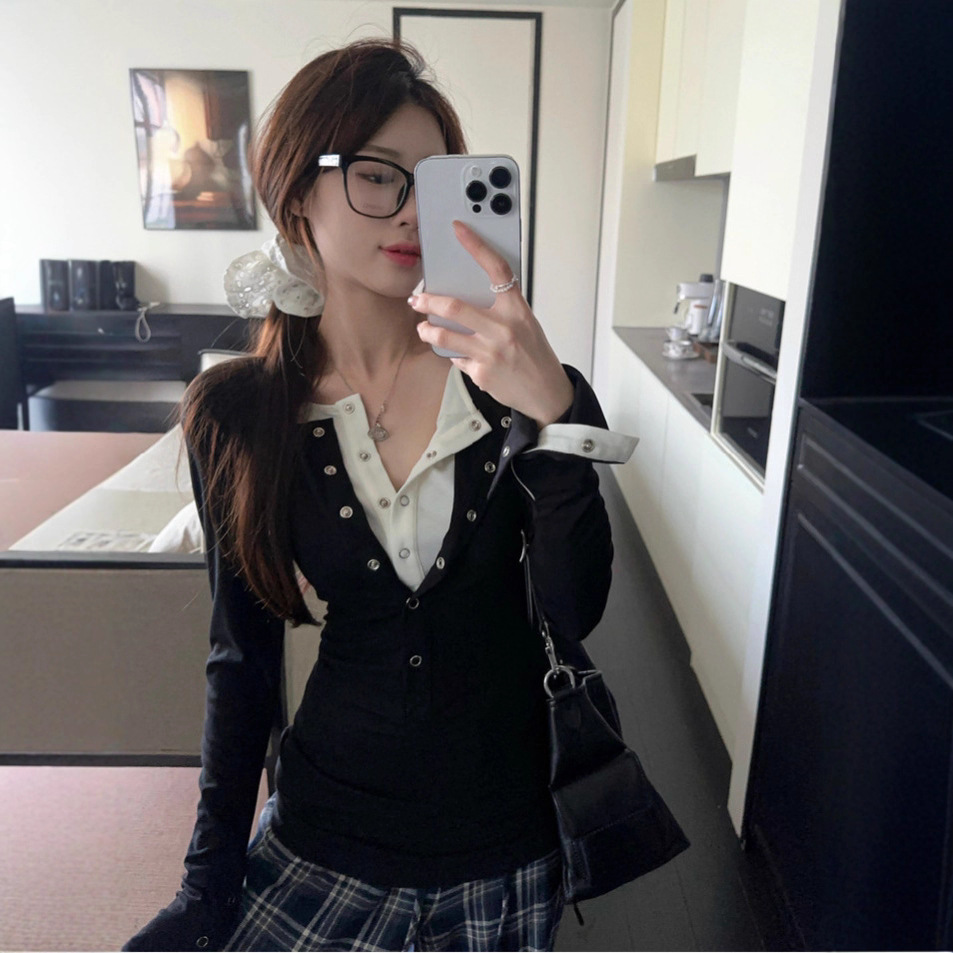休闲黑色假两件长袖T恤女早秋设计感小众修身打底衫独特别致上衣