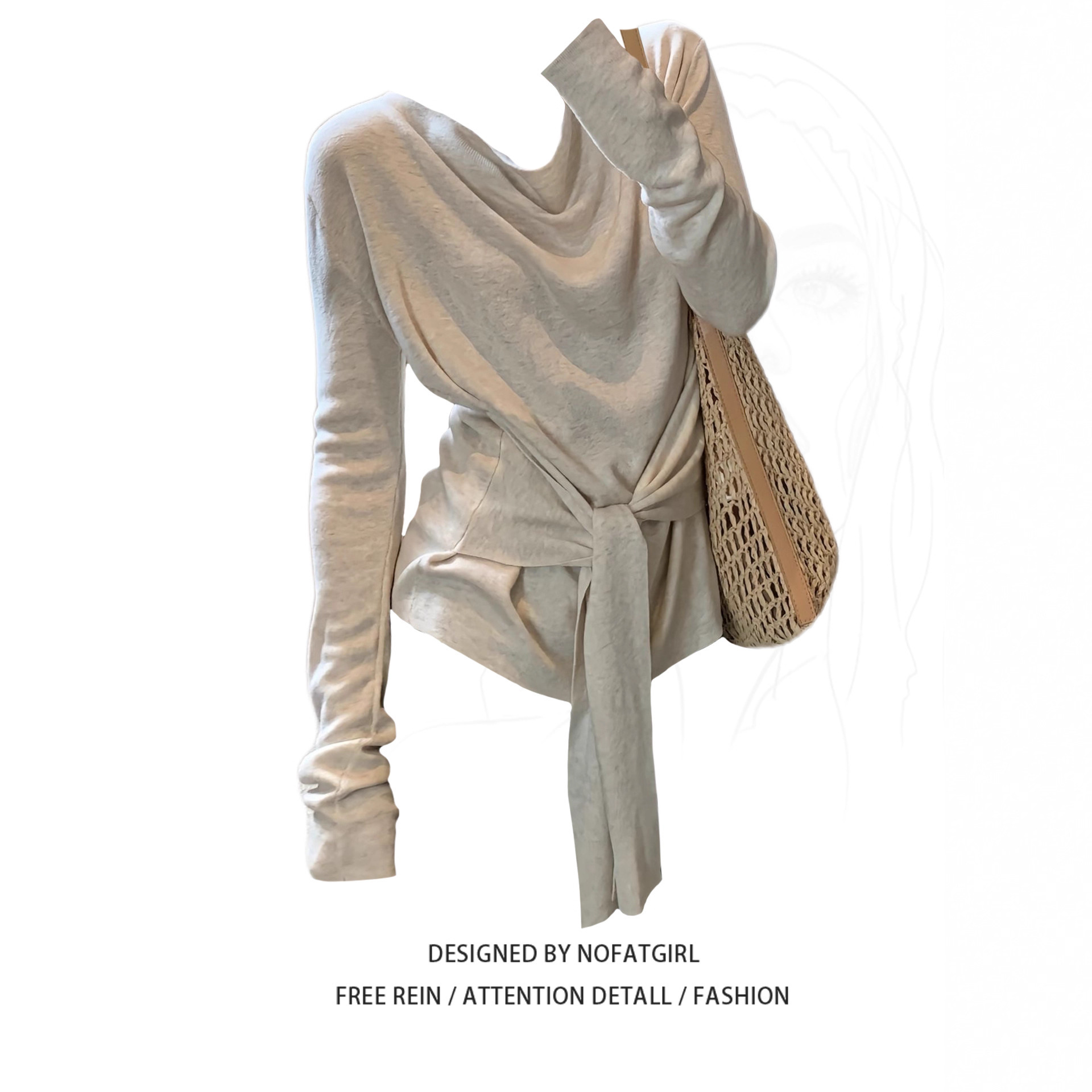 韩系设计感小众荡领腰带T恤女早秋季收腰松弛感褶皱绑带显瘦上衣