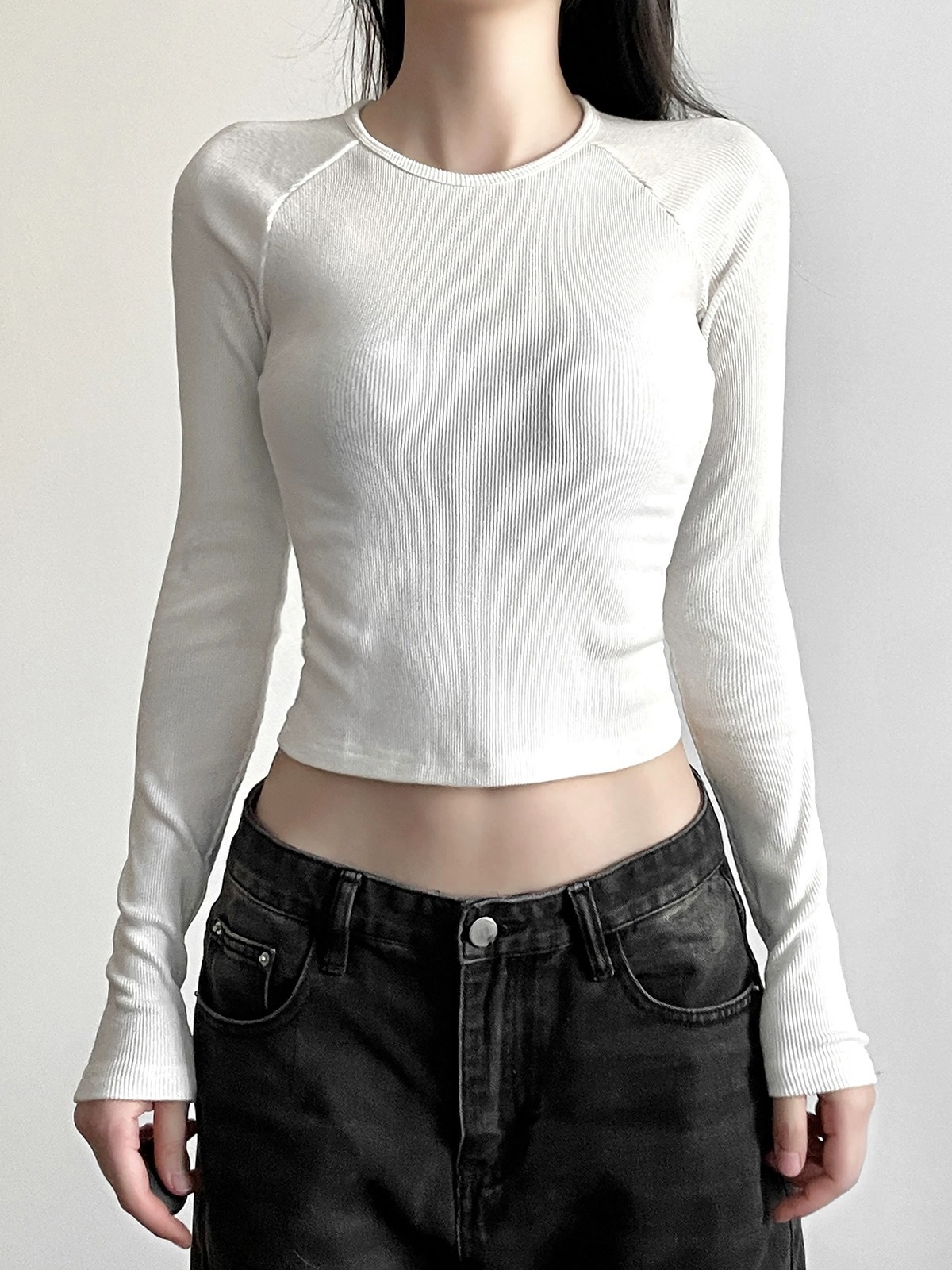 セクシーなホットガール向け、海外貿易向け、スリムフィットのショート丈長袖Tシャツ、女性用ベーシック長袖トップス
