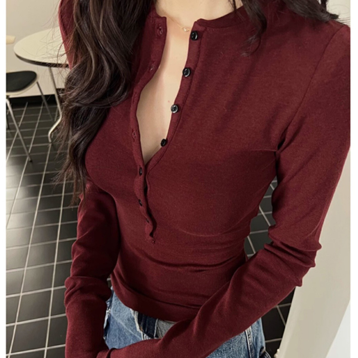纯欲辣妹酒红色v领长袖内搭打底衫女春秋修身紧身正肩t恤短款上衣