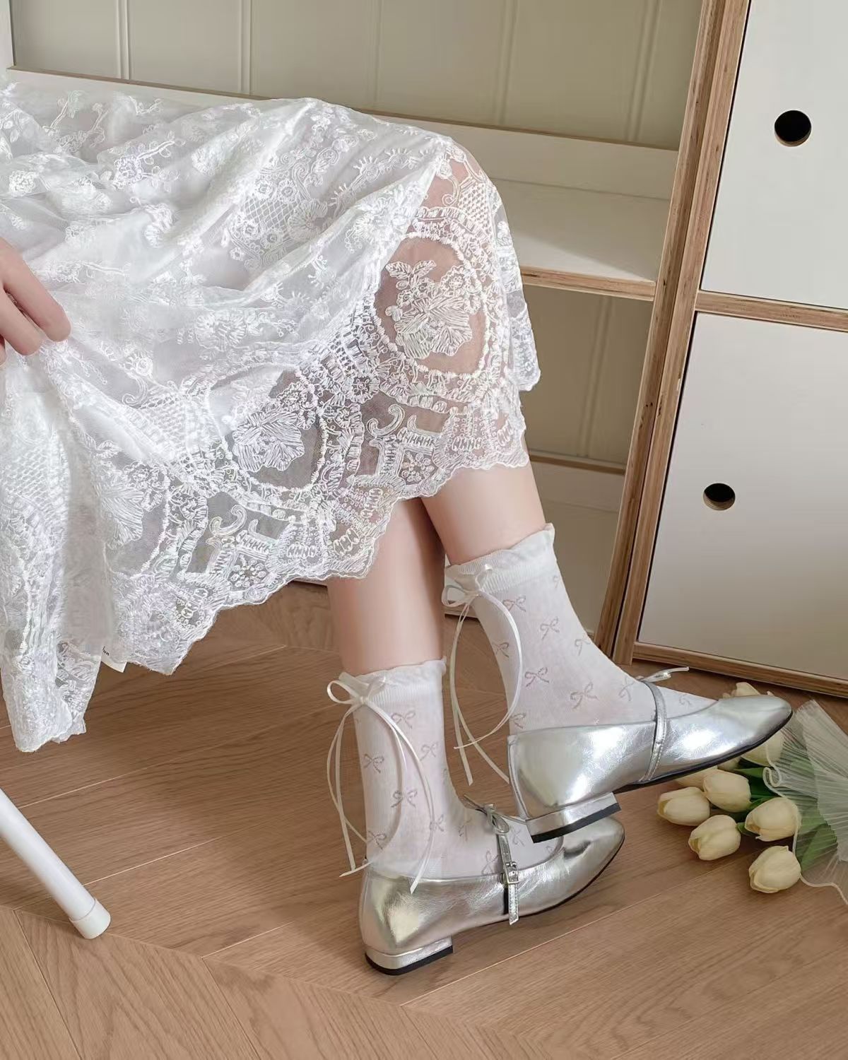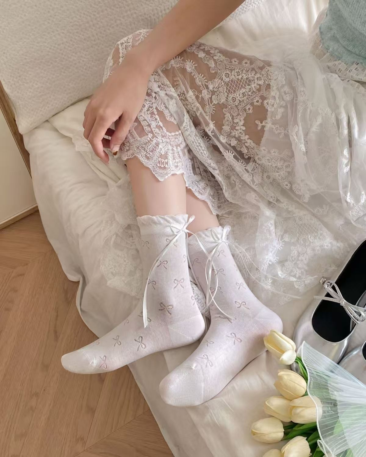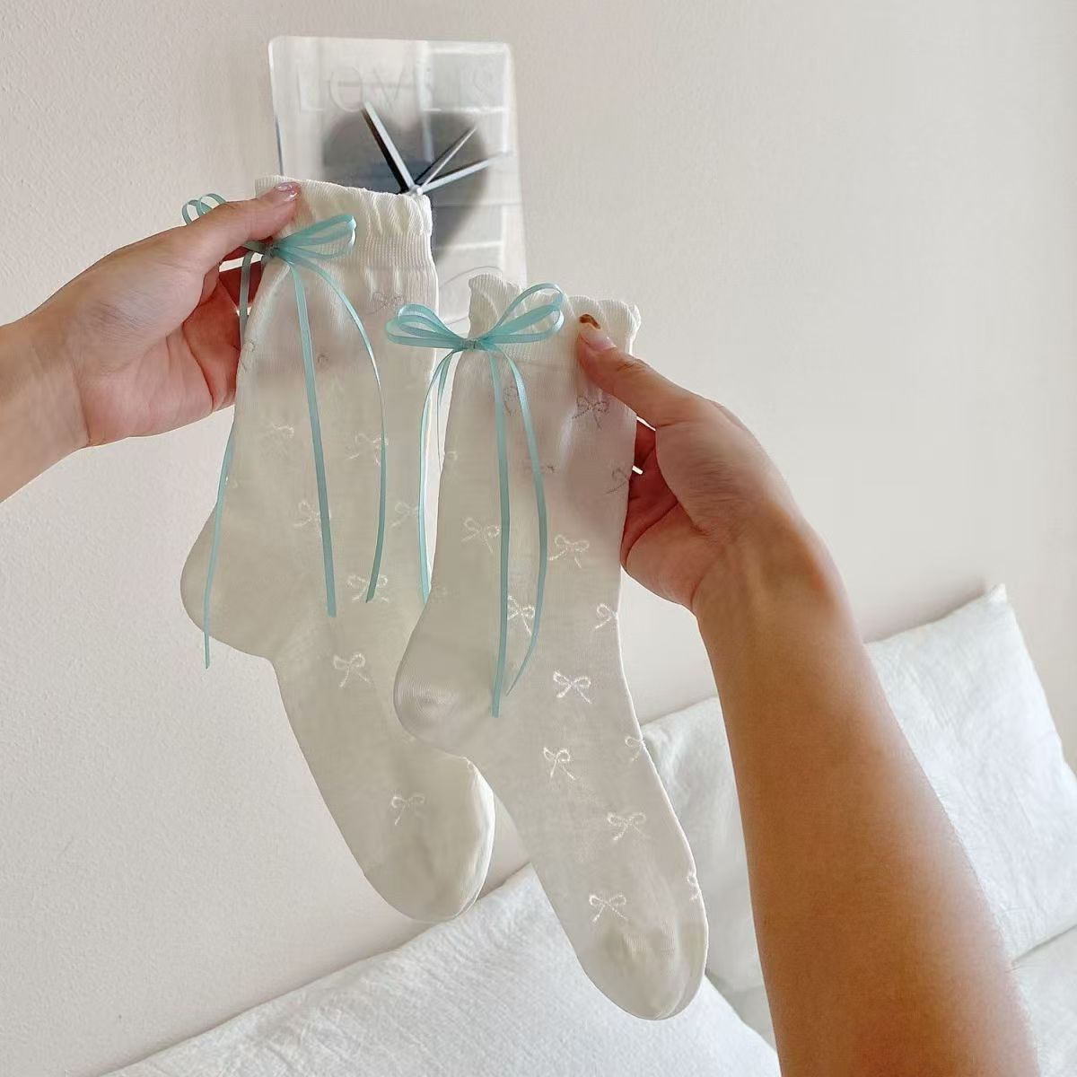 薄いフランスのリボンの蝶結びの靴下の女性の中筒の靴下の透かし彫りの山の靴下の通気性の黒色の白い夏のストッキング