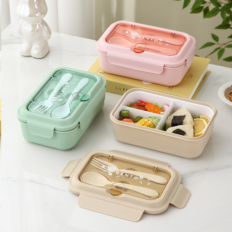 跨境亚马逊分格饭盒双层PP塑料可微波炉加热配叉勺二格便当盒餐盒