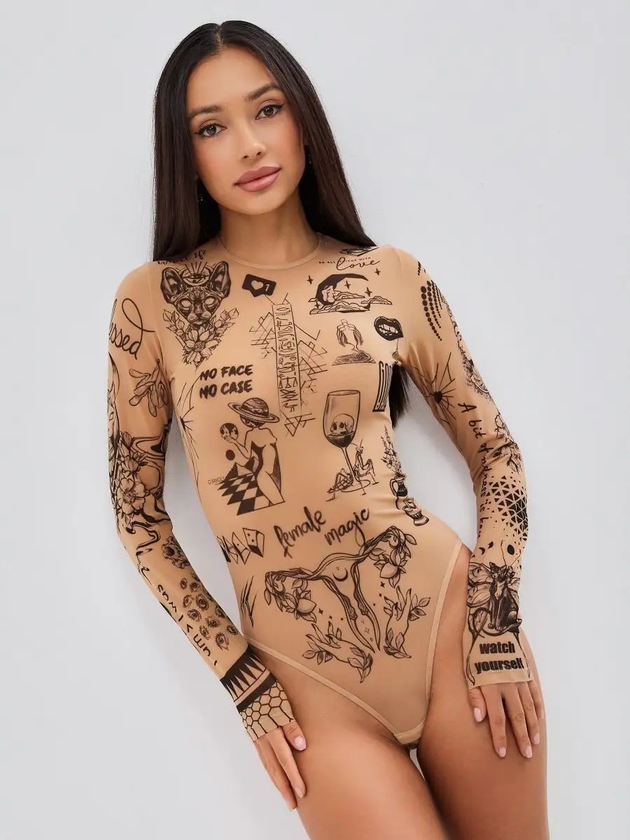 春夏の新しいヨーロッパとアメリカンスタイルのパターンプリントセクシーなホットガールシースルー女性の長袖タイトなジャンプスーツ卸売クロスボーダー