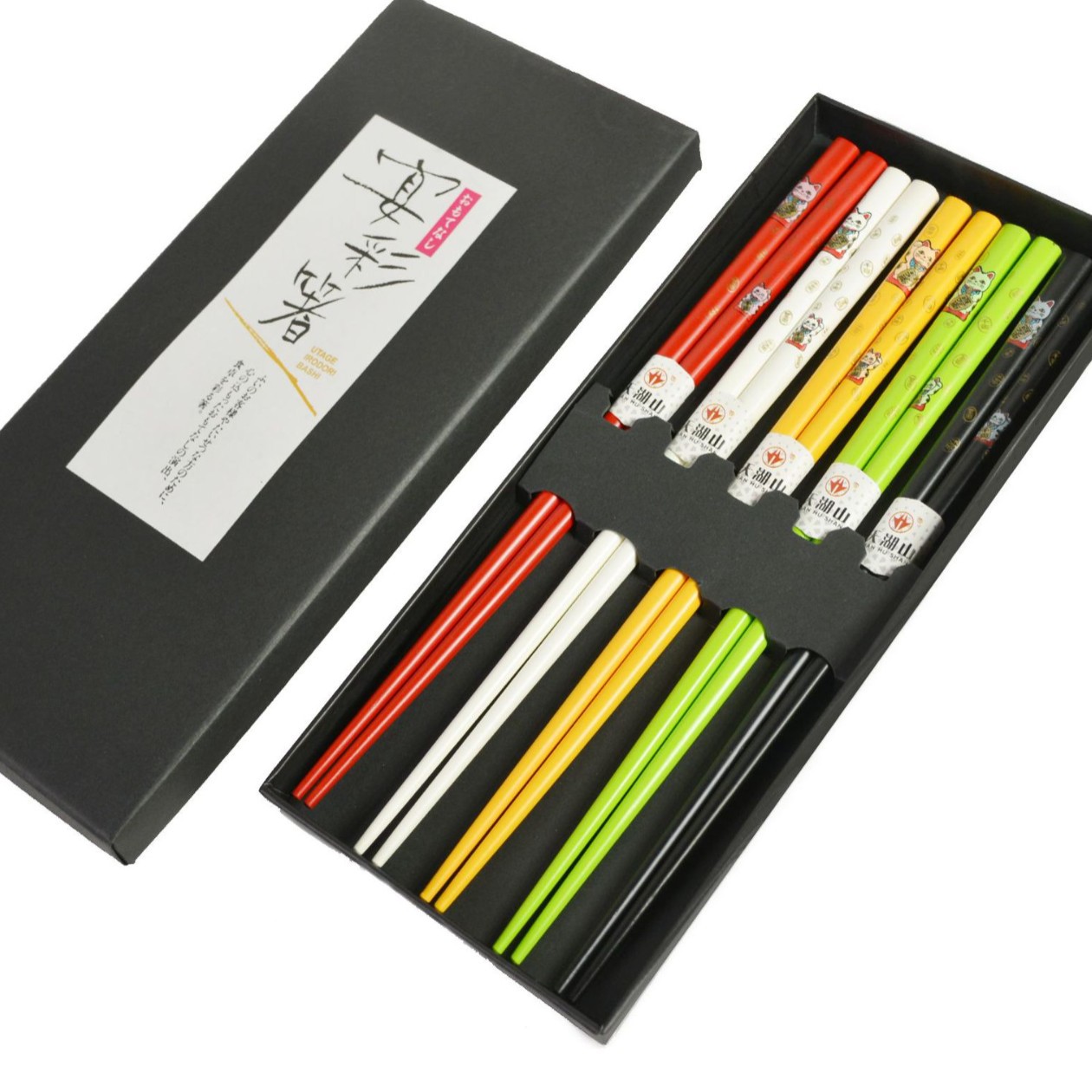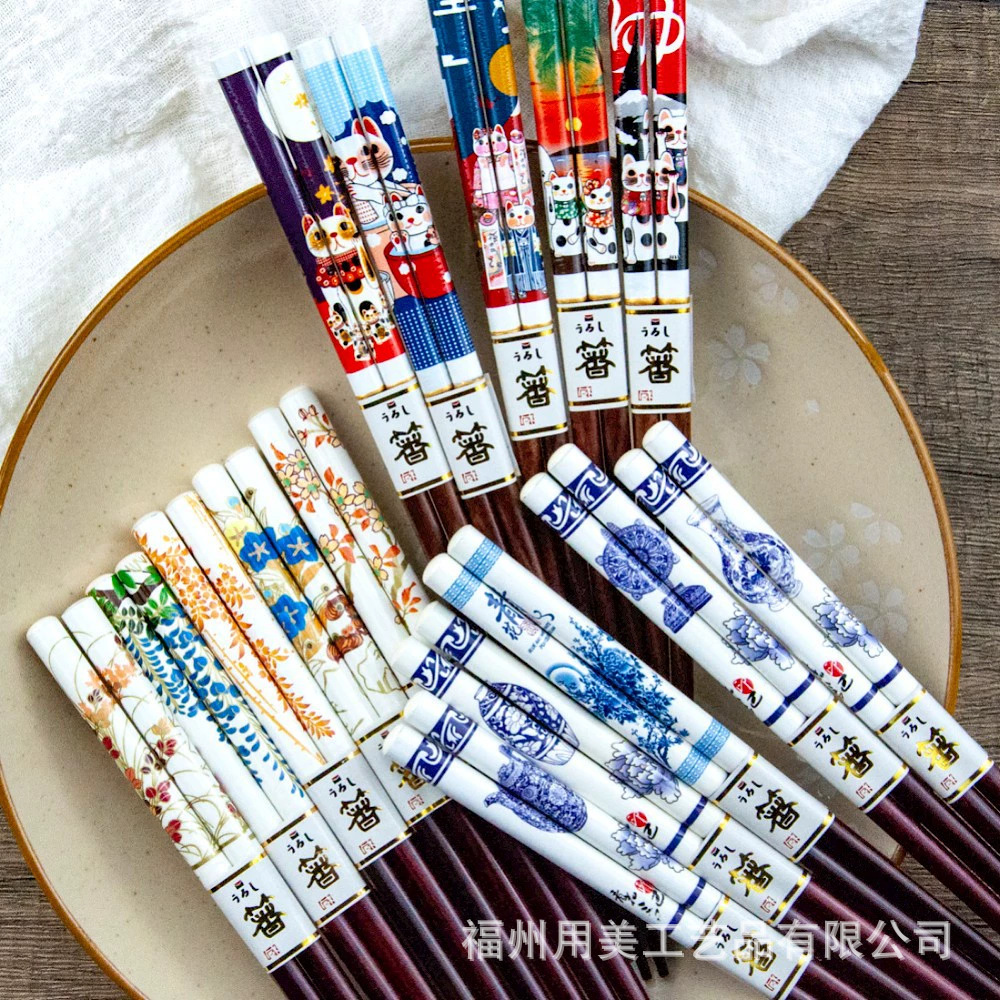 中国風箸 熱転写印刷 5膳入り 箱入り 模造磁器 アート箸 家庭用 高級感箸 招き猫柄