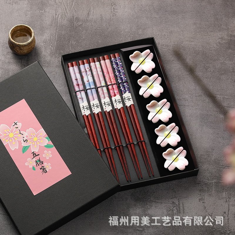 陶磁桜箸置き家庭用高颜値食器セット五足入れ熱転写花一人箸お土産