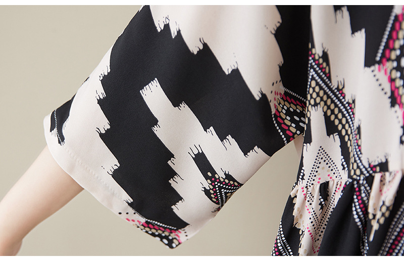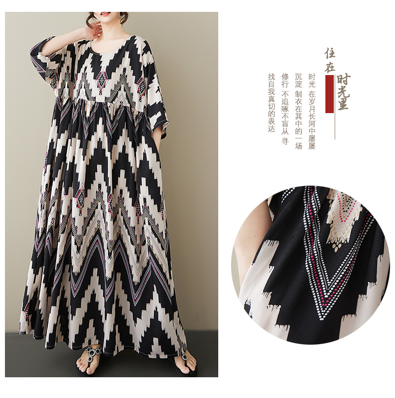 シンプルでファッション的なvネックのロングスカートの綿のシルクのプリントの夏の新型は太って半袖の丸首の対外貿易のワンピースを増加します。