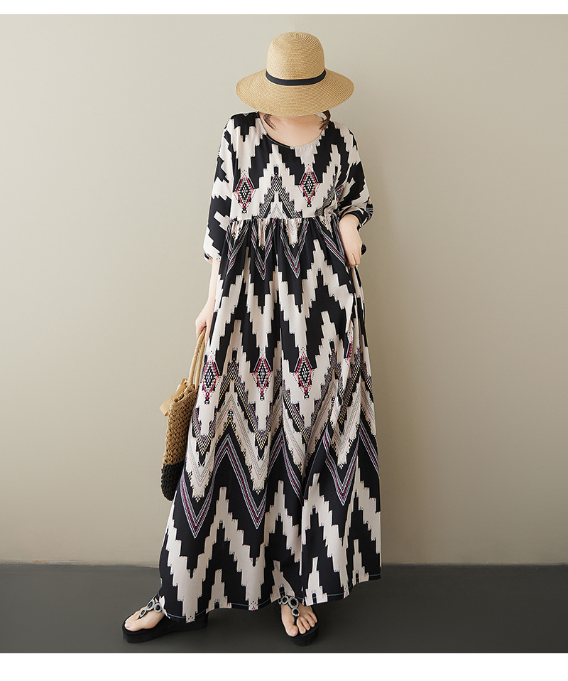 2025早秋新款花色度假风旅游V领复古长裙遮肉棉麻连衣裙