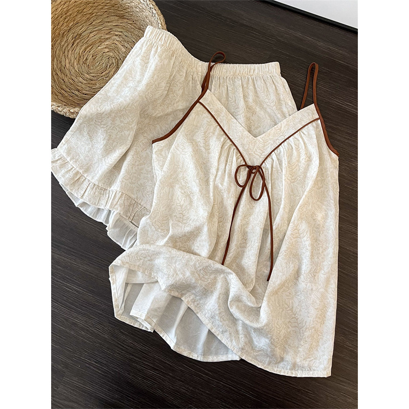 新しい中国風の花柄サスペンダーパジャマ女性のための夏スタイルは外で着用できますルーズ V ネックベストショーツホーム服セット