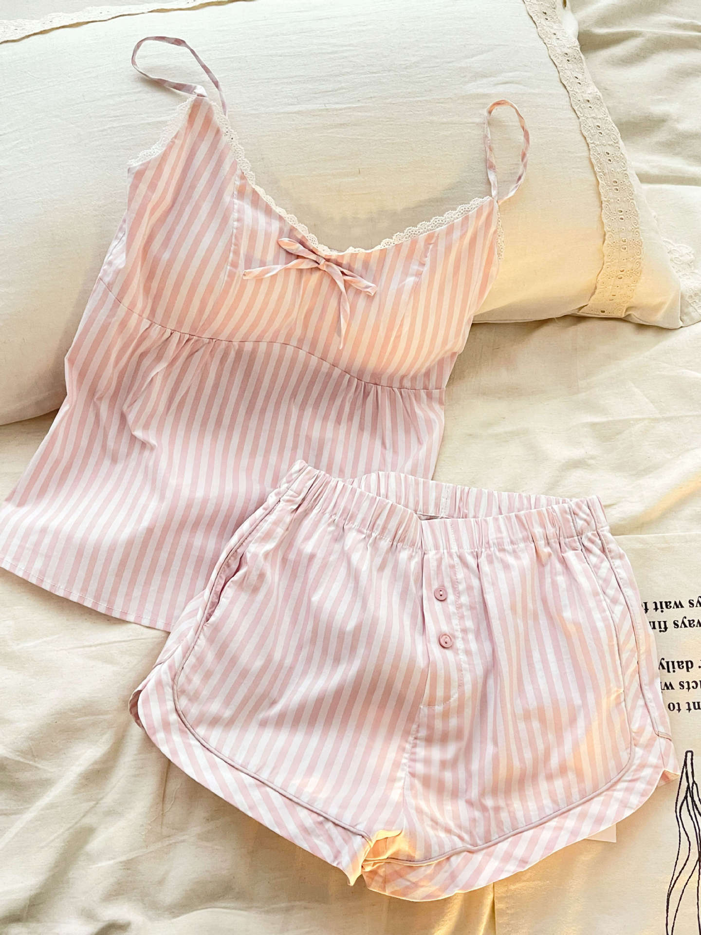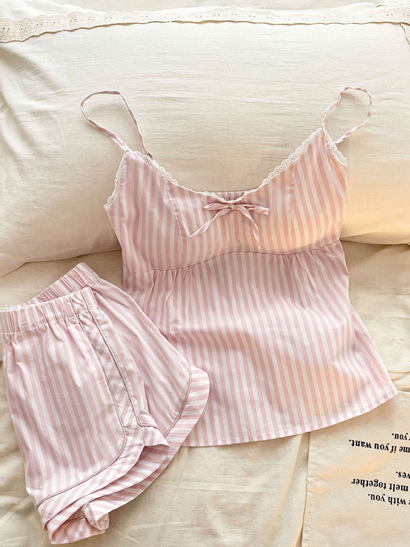 ピンクの甘いレースの縁に胸パッドのストライプのストラップのパジャマの女性の春夏2025の新型の蝶結びの家庭服