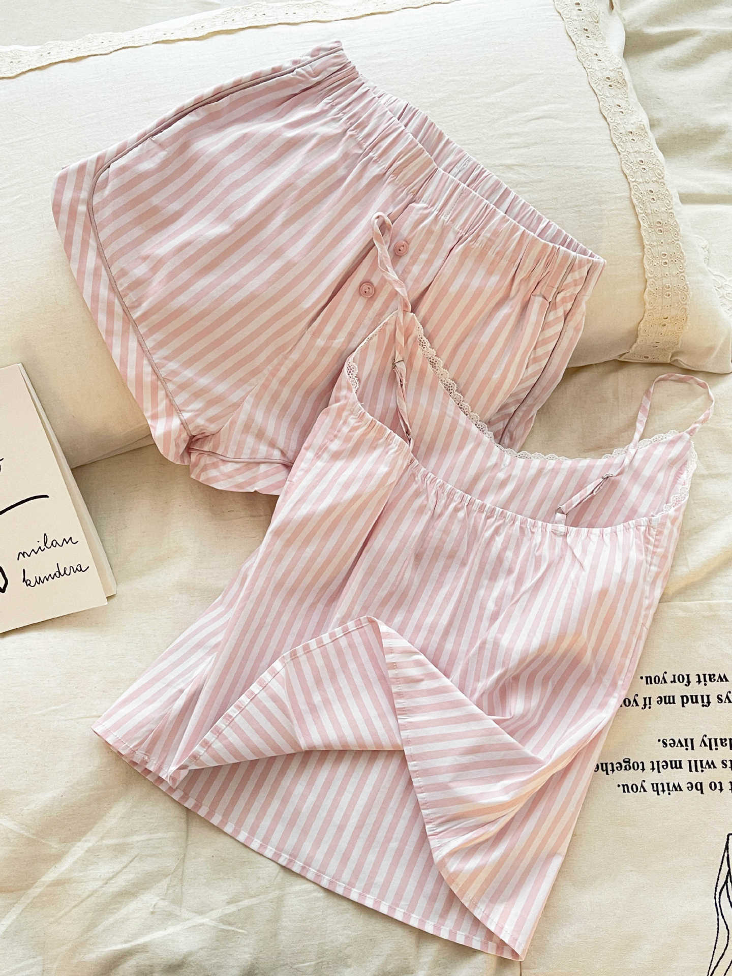 韓国系ブルーストライプ純欲レースパジャマ女性用夏キャミソール半ズボン快適家庭服セット
