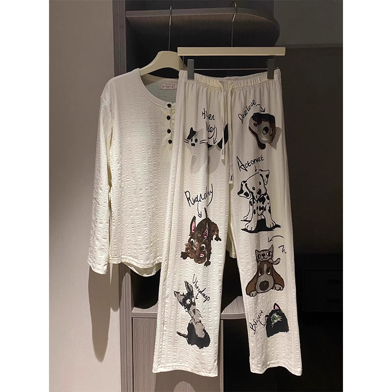 かわいい子犬落書きプリント長袖パジャマ少女春夏2025新型ゆるい家庭服2点セット夏
