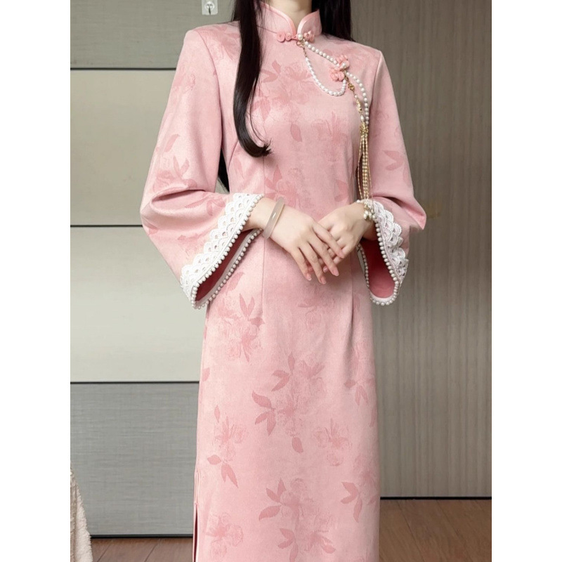 2025秋冬新作ピンク逆袖改良チャイナドレスレディスタイル新中国風ロングドレス