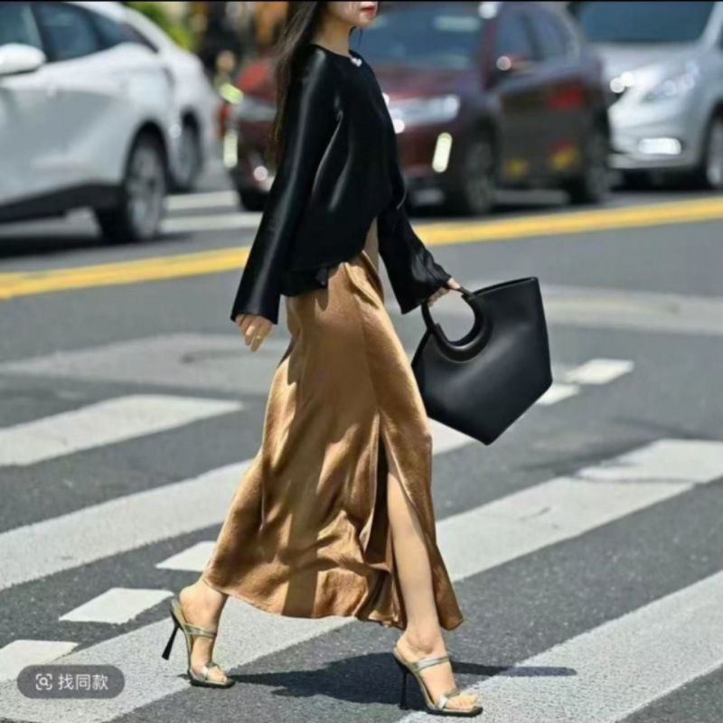 高品質の字のスカートの側はフォークの真珠の光のサテンの気質の半身のスカートを開けて肉を遮って足が長くて痩せています。