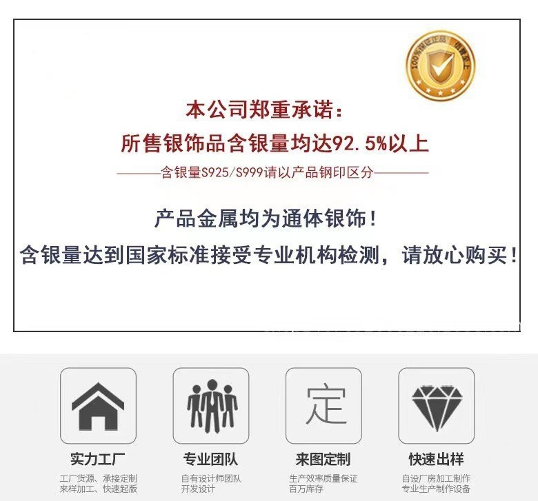 我们工厂产品均为纯银饰品:原材料采用的是标准纯银,含银量为百分之92.5%与99.0%或99.9%。高品质的纯银镶嵌珠宝首饰产品电镀白金层,表面保色长久,不易褪色,防氧化的纯银珠宝首饰!我司的产品为高端品质,实力和产品质量获得业界的认可。专业专注为 淘宝/天猫, 京东, 速卖通, EBAY,  亚马逊,WISH,敦煌,LAZADA,微商等网络大平台;以及实体批发商,外贸公司等国内外渠道商提供货源与加工定做。产品每款都可提供材质检测证书并且支持复检,您收到货品后可送到权威机构进行复检, 为了各大商家采购到称心如意的产品您可以先行试小量采样拿货,再续长期合作。