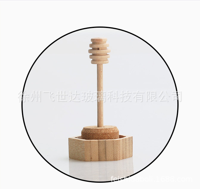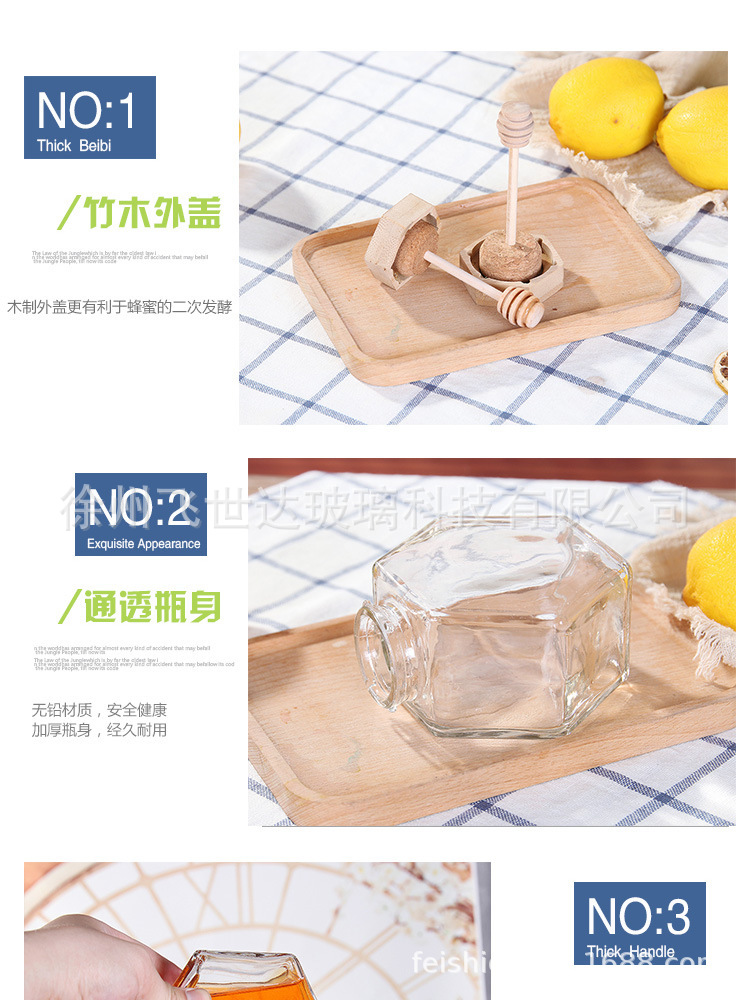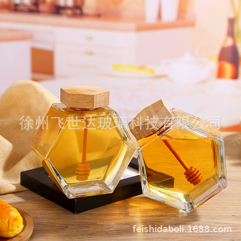 竹木盖玻璃蜂蜜瓶子密封装空瓶六角果酱瓶玻璃罐现货批发带搅拌棒