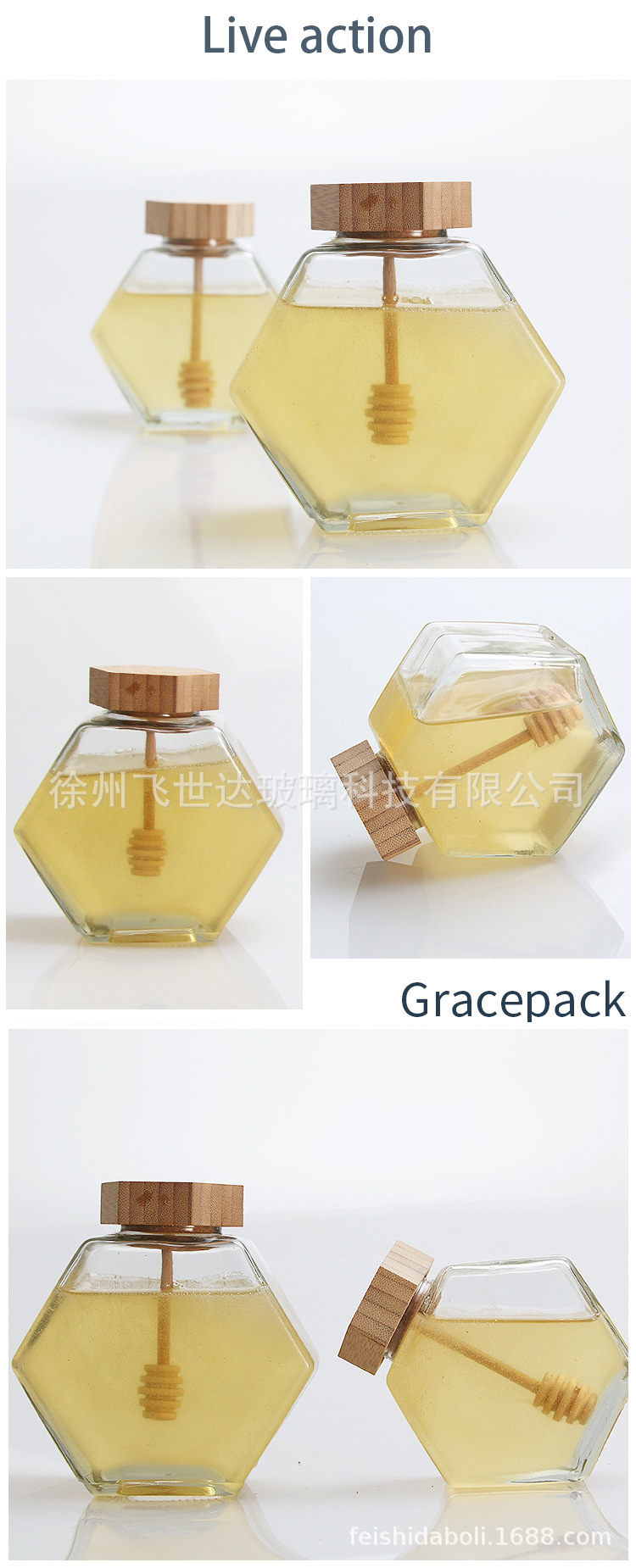 国境を越えた卸売フラット六角形蜂蜜ガラス瓶木製蓋と撹拌棒家庭用六角形鉄蓋ジャム詰め替えボトル