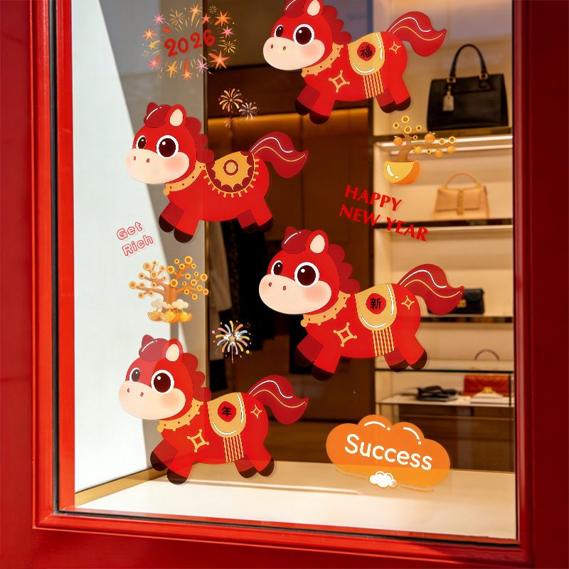 店铺橱窗卡通小马红色发财树烟花装饰窗花2026新年静电玻璃门贴纸