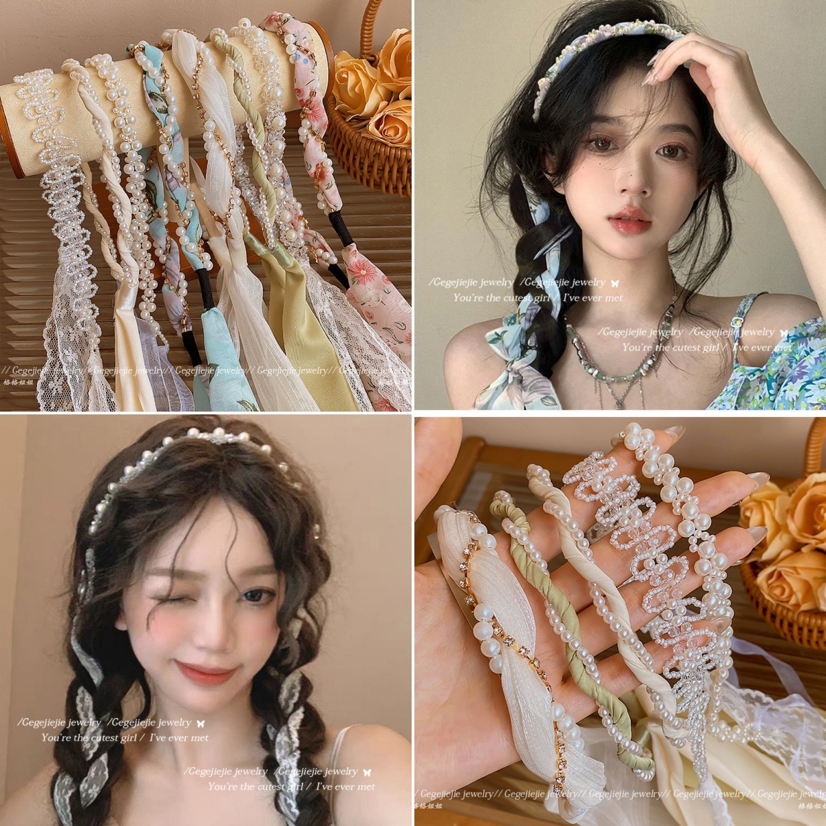 夏の超仙編みのシルクタオルの花のリボンのカチューシャの一体の馬尾は髪の糸を縛ってネットの赤い真珠の髪のひものカチューシャを持ちます。