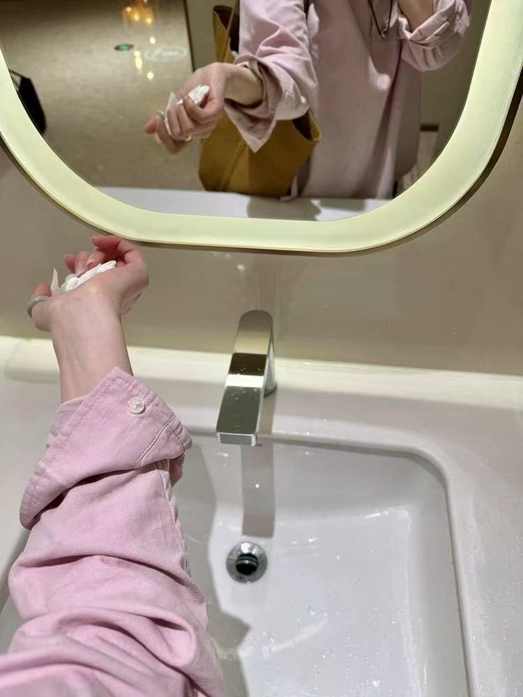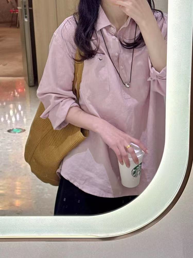 純綿のピンクのpoloシャツの女性は春と秋に新型のフランスの高級感のある夏服の長袖の上着のデザイン感を着ます。