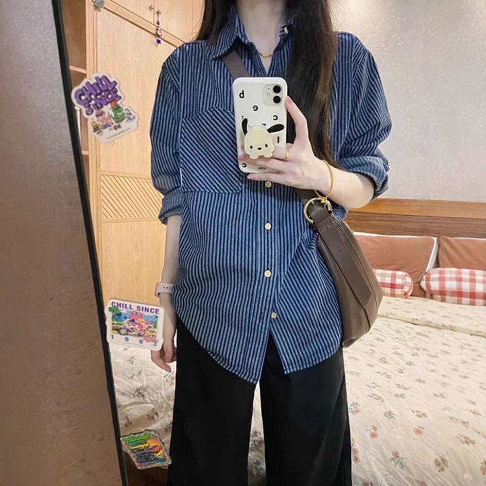香港式のレトロな青いストライプのシャツの女性の春と秋の新型のゆったりしたカジュアルな初秋の薄いタイプのシャツの上着