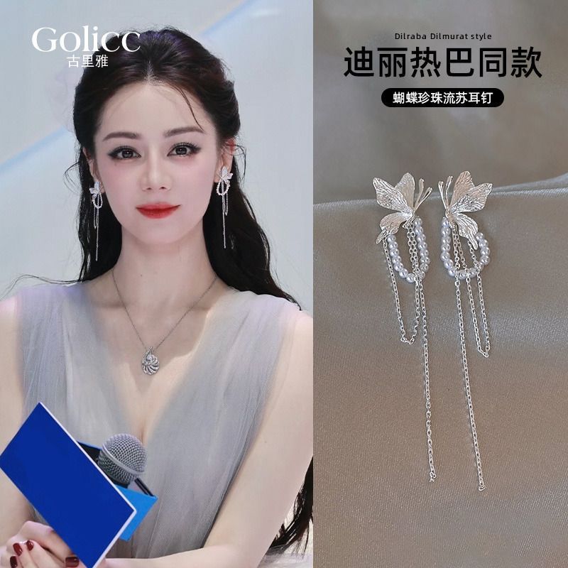 银色蝴蝶珍珠流苏耳钉女2025新款高级感轻奢小众耳环度假风耳饰夏