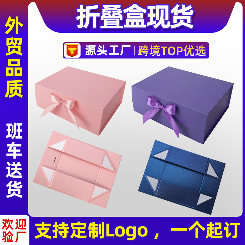 跨境一片式折叠礼品盒磁吸空盒蝴蝶结丝带手提包装盒收纳盒现货