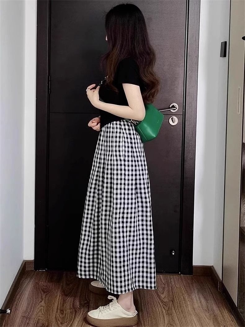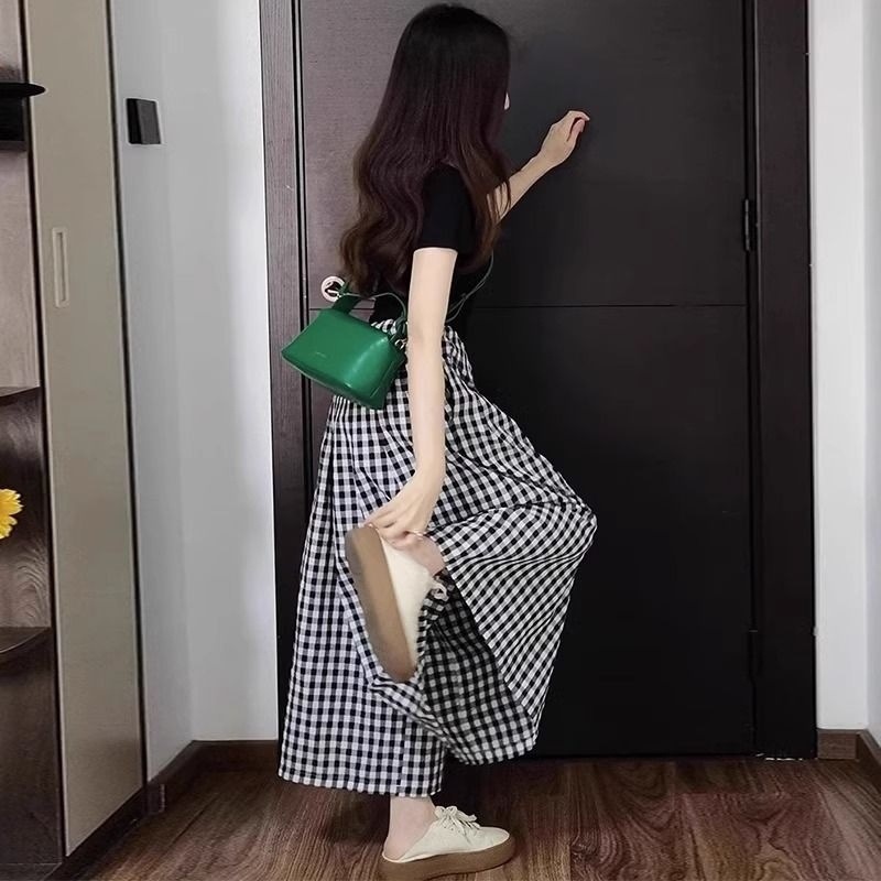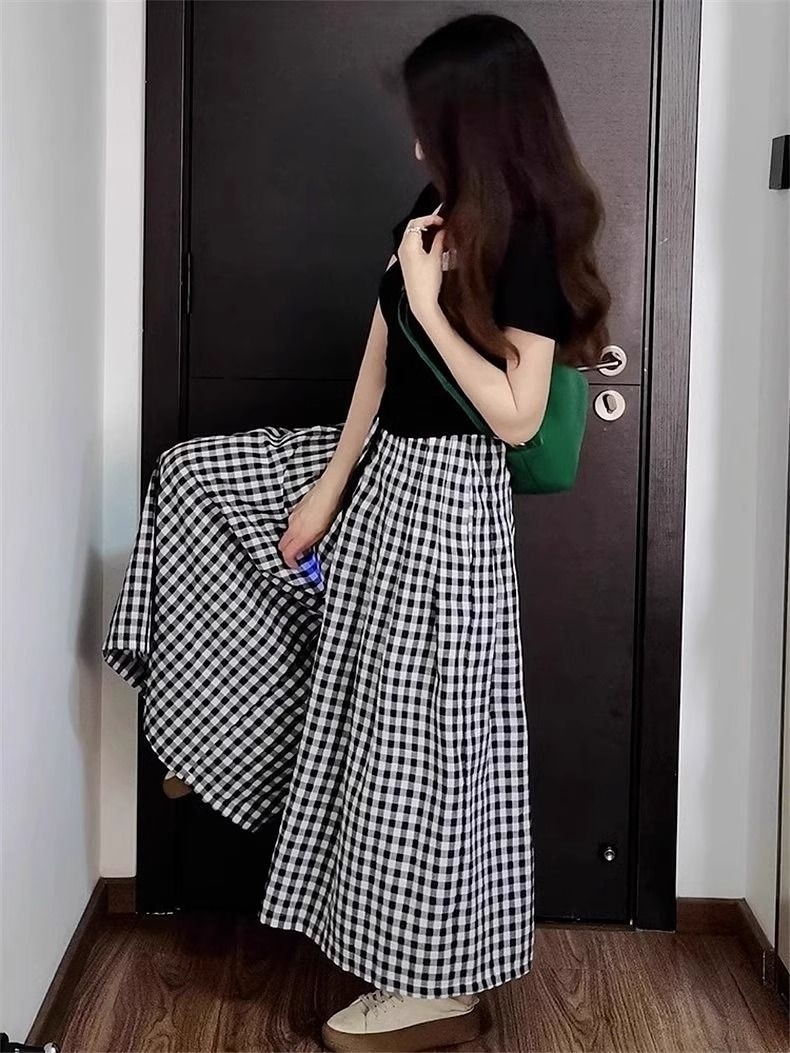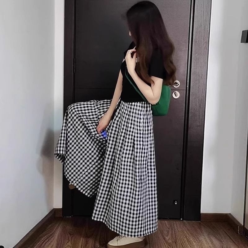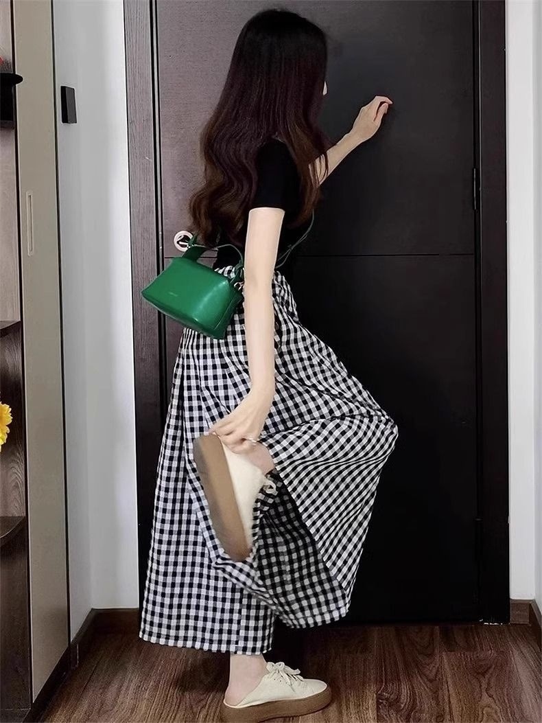 プラスサイズファットmm夏新作薄手ニット半袖+スリム不規則チェック柄スカートパンツスリムツーピーストレンドセット