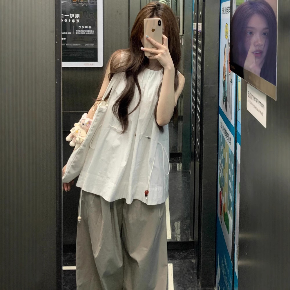 デザイン感小衆レジャースポーツスーツ女性夏ノースリーブ引きひも上着薄手工装ワイドパンツ2点セット