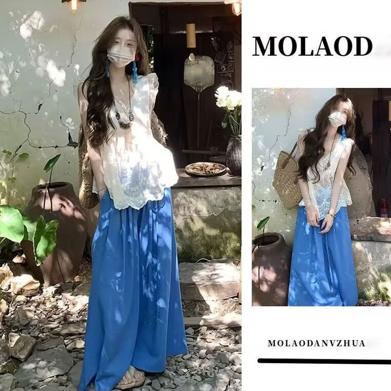 2025夏季新款V领蕾丝边小飞袖微透小众上衣高腰撞色阔腿裤两件套