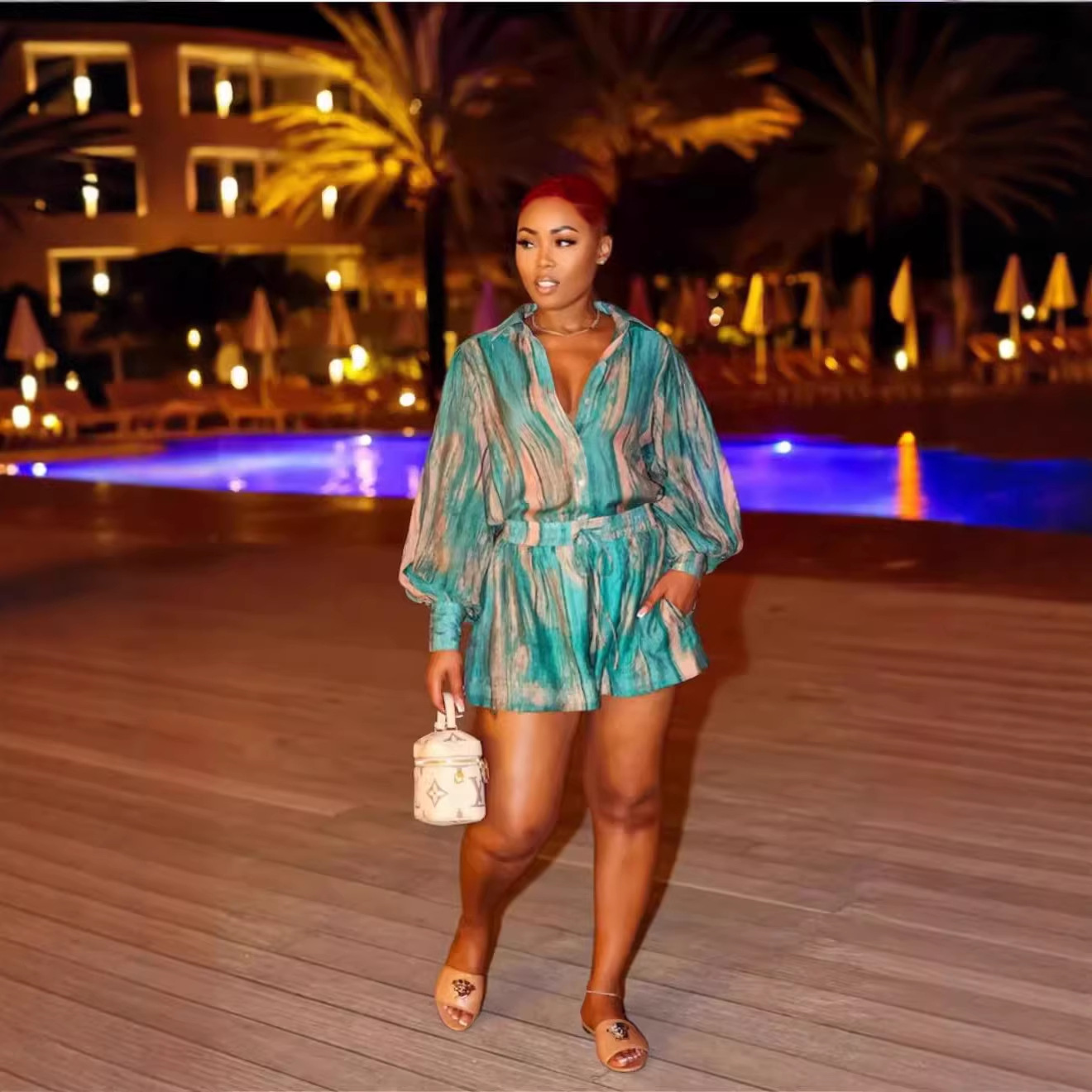 休闲时尚印花套装2026春夏新款跨境欧美舒适清新短袖短裤两套女装