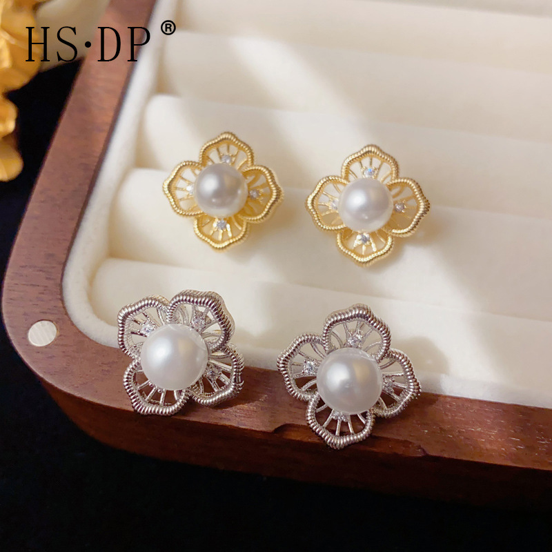 法式复古时尚简约金属镂空四叶花珍珠耳钉个性轻奢百搭设计感耳环