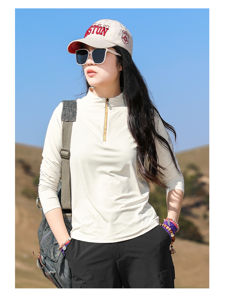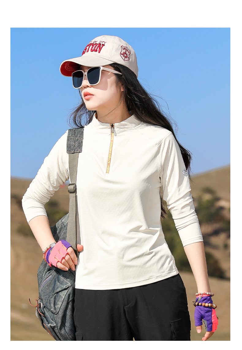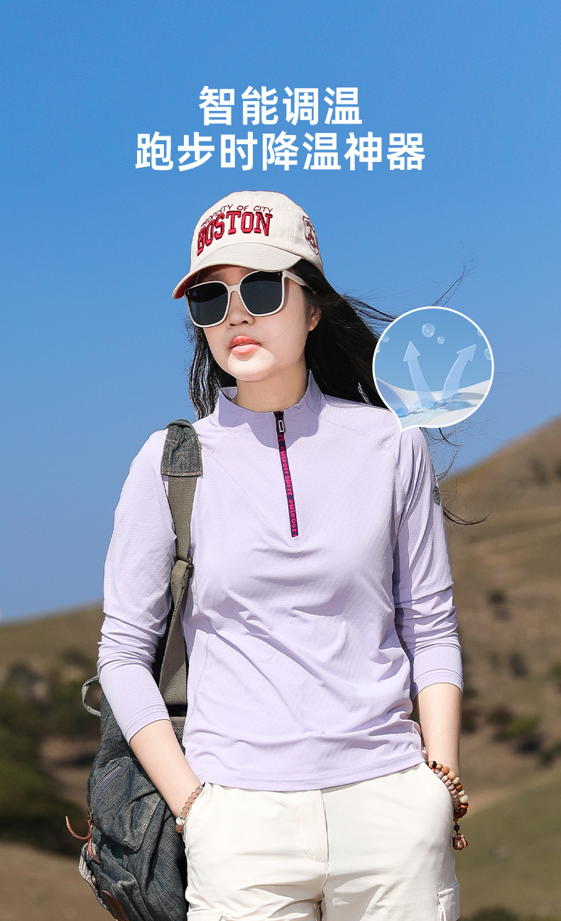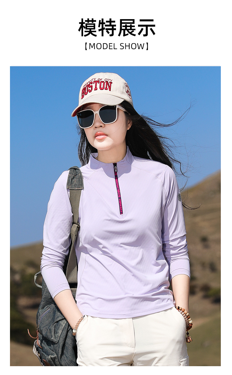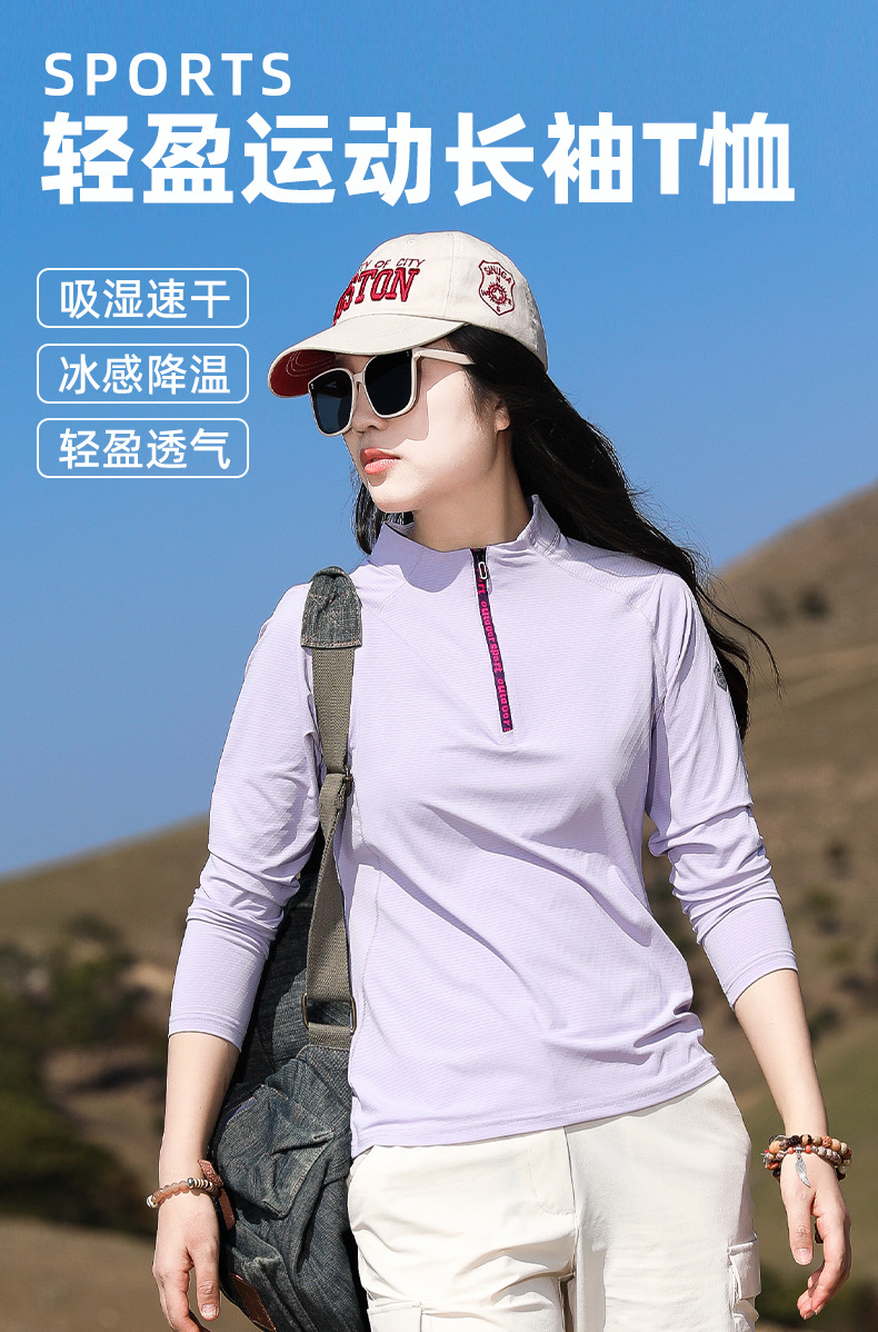 戸外春夏日焼け止め登山徒歩弾力快乾衣立襟ランニングフィットネス通気長袖速乾tシャツ女