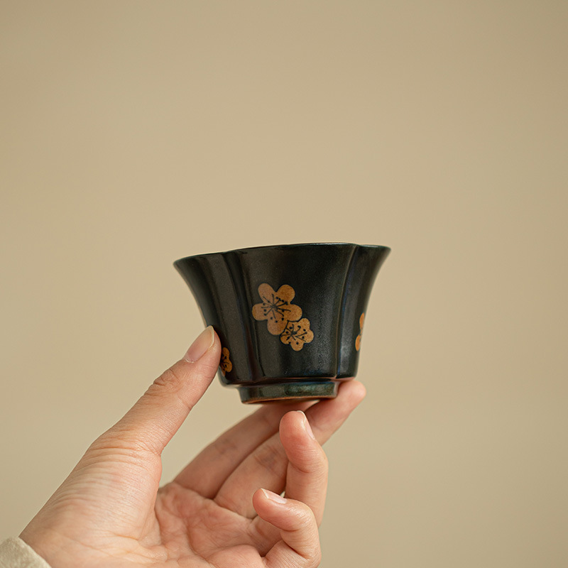 纯手工银上作画黑釉牡丹茶杯主人杯客杯陶瓷茶具精致品茗杯功夫茶