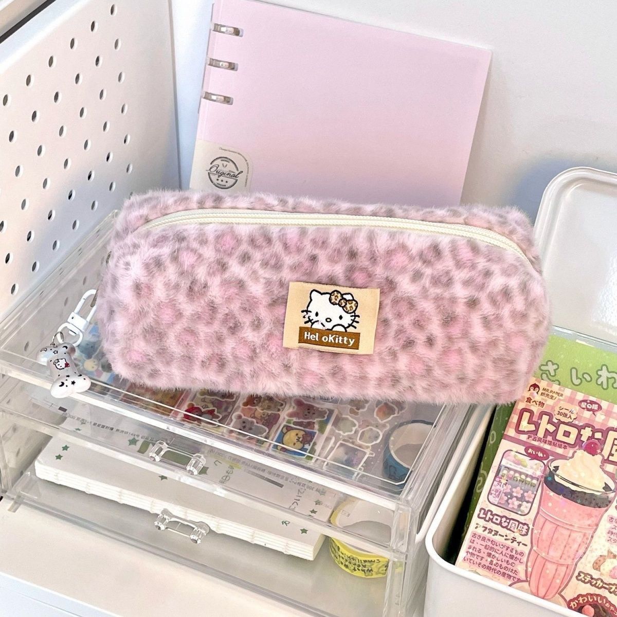 新款粉色豹纹KT猫笔袋ins创意毛绒大容量学生文具收纳袋化妆包