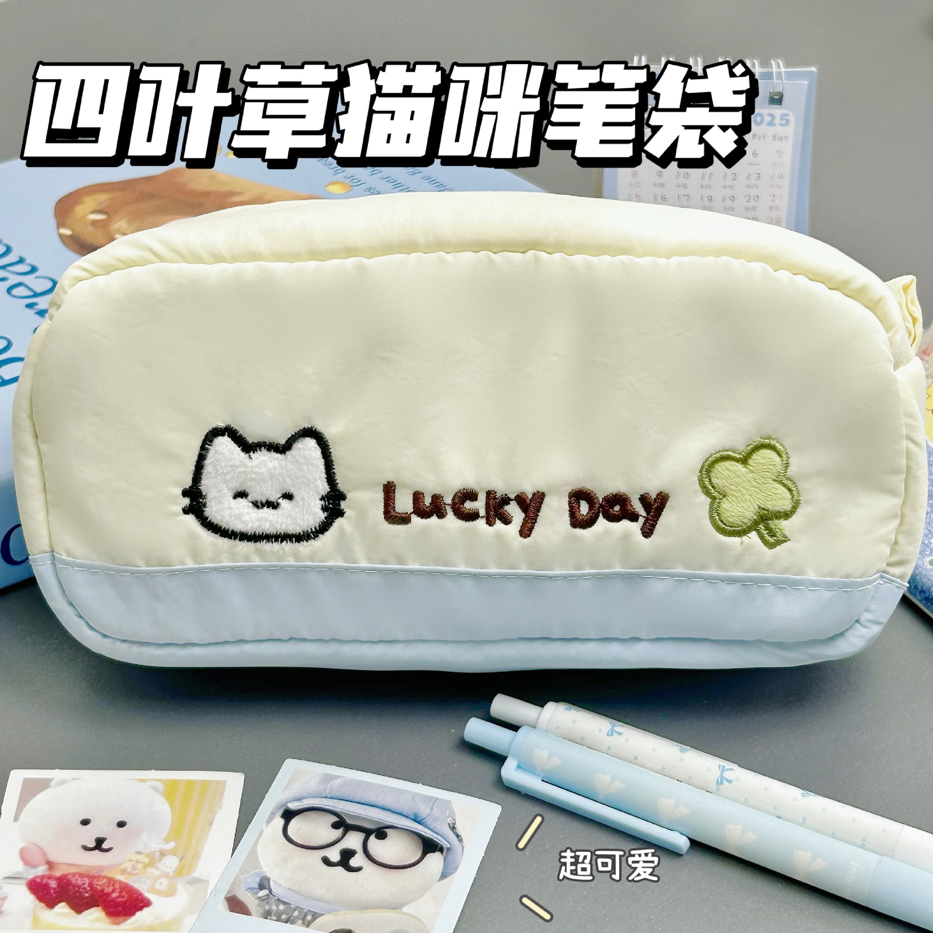 可爱四叶草小猫刺绣撞色笔袋ins软呼呼大容量学生文具收纳铅笔袋
