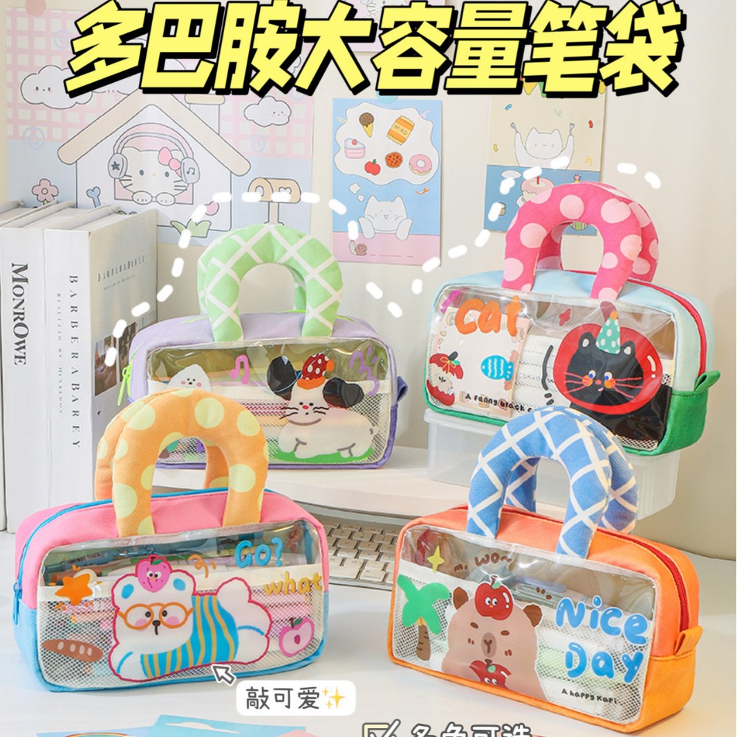 大容量手提笔袋可爱卡通透明Ins高颜值文具袋手提学生文具收纳袋